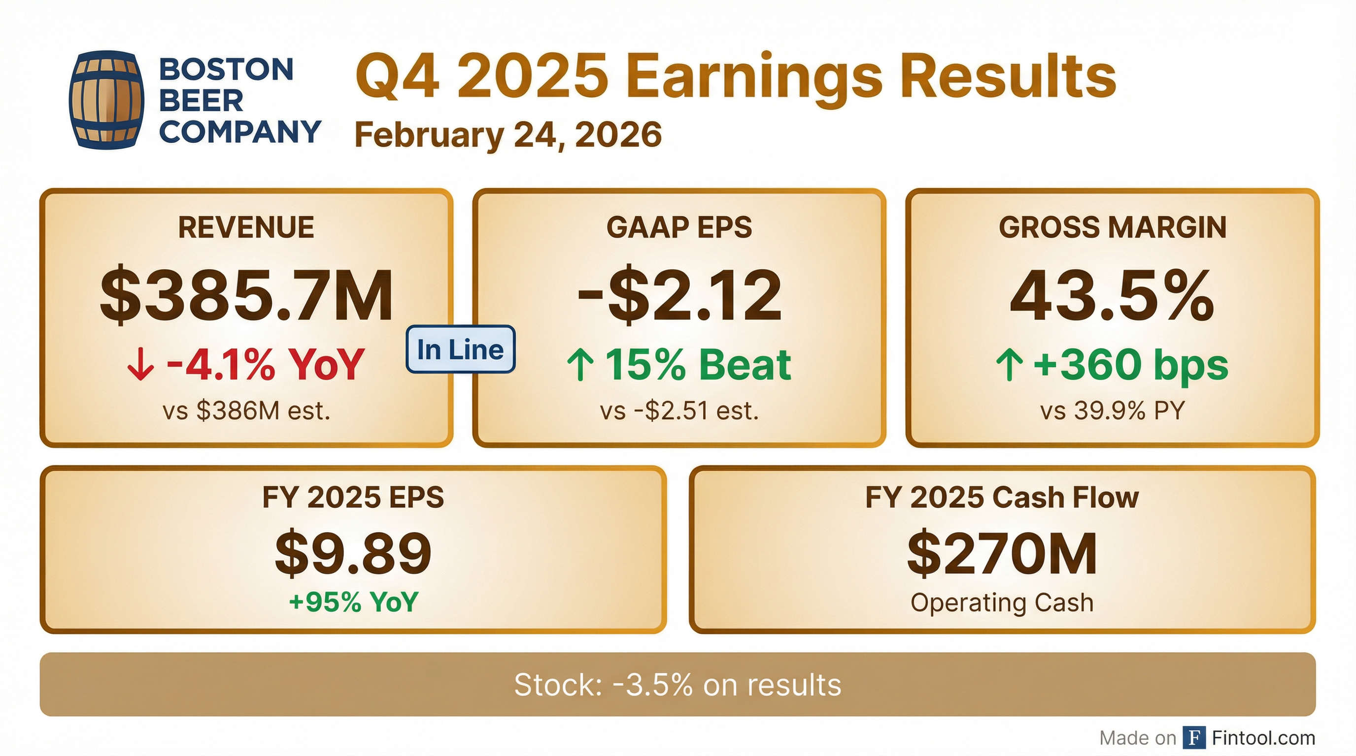 - The Boston Beer Company reported 2025 full-year revenue down 2.4% and EPS of $9.89, up 4.7% year-over-year (excluding certain charges). Gross margin expanded by 410 basis points to 48.5%.