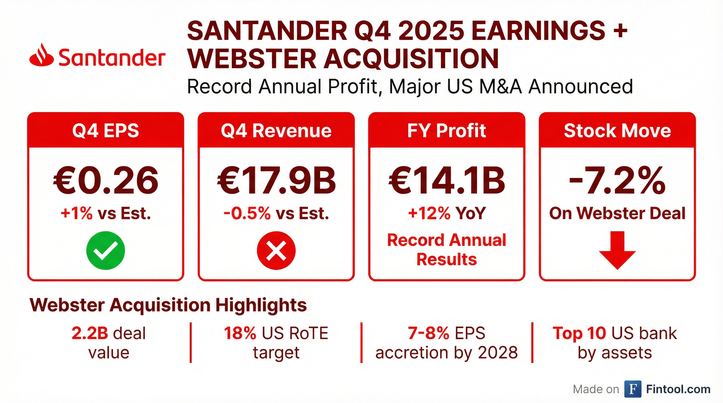 - Banco Santander reported a Q4 2025 attributable profit of EUR 3,764 million, an increase of 7% compared to Q3 2025, contributing to a full-year 2025 attributable profit of EUR 14,101 million, which is 12% higher year-on-year.
