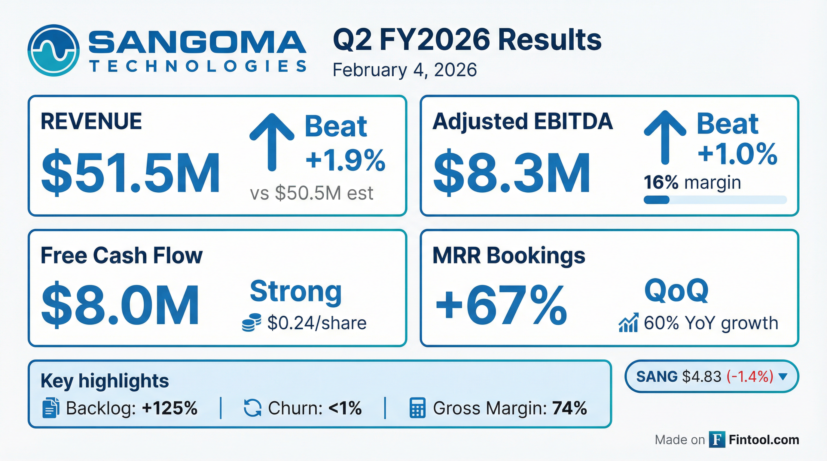 - Sangoma Technologies reported Q2 2026 revenue of $51.5 million, a 1.2% sequential increase, with adjusted EBITDA of $8.3 million (16% margin) and $8 million in free cash flow.