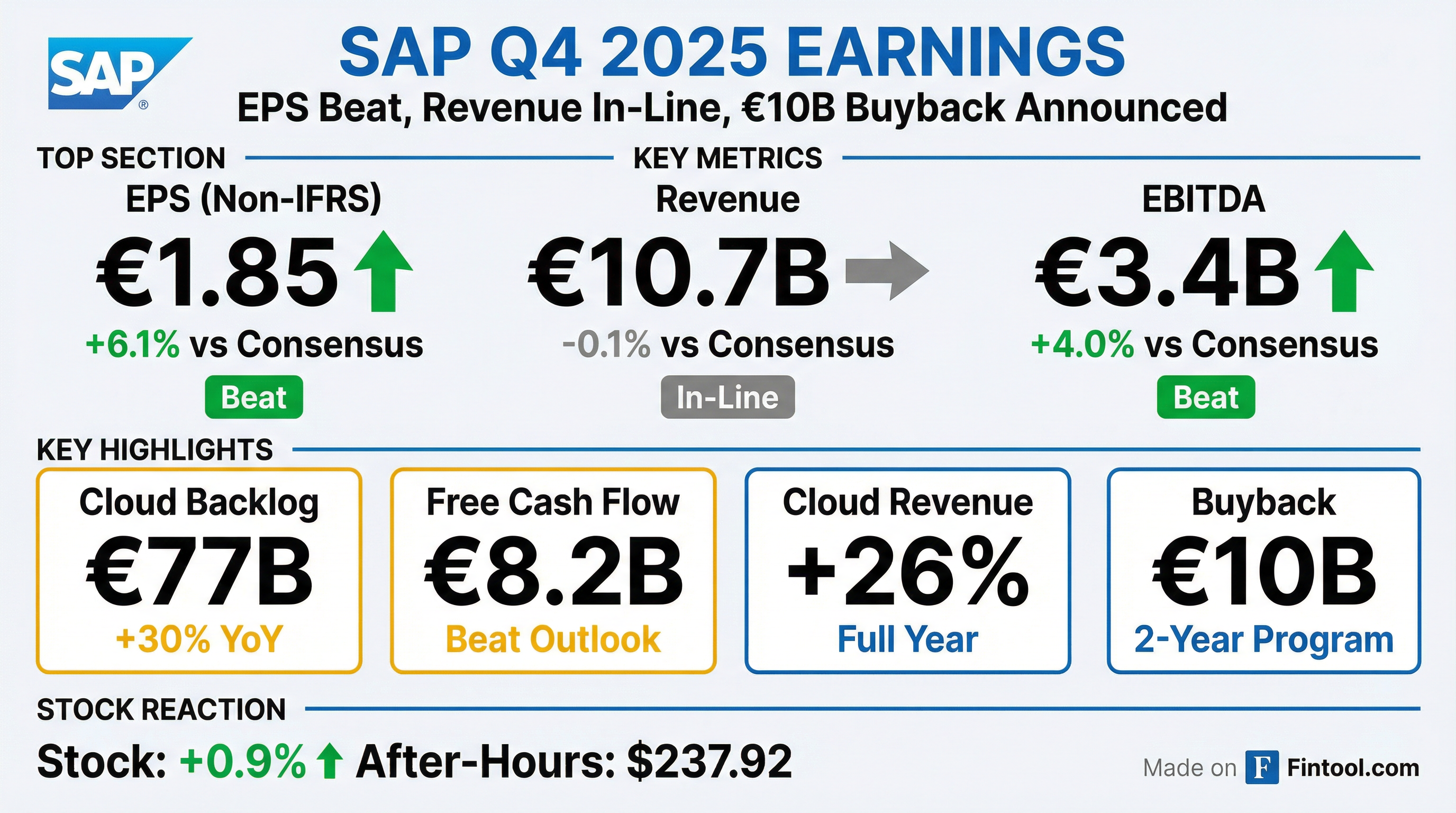 - SAP reported a strong Q4 2025 and full-year 2025 performance, beating its operating profit and free cash flow outlooks for the year. Total revenue for the full year approached EUR 37 billion, up 11%, and cloud revenue grew 26% year-over-year.