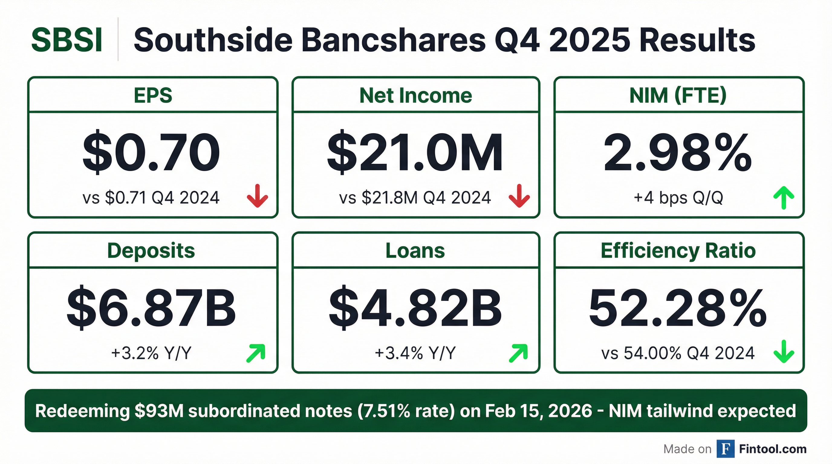 - The company's tax-equivalent net interest margin increased four basis points linked quarter to 2.98% for Q4 2025. Southside Bancshares, Inc. plans to redeem $93 million in subordinated notes on February 15, 2026, which is expected to positively impact net interest margin in the first quarter.