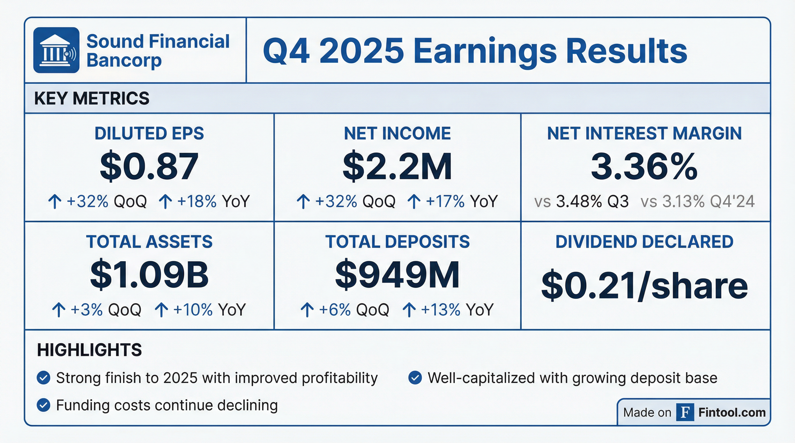 - Sound Financial Bancorp, Inc. reported net income of $2.2 million, or $0.87 diluted earnings per share, for the quarter ended December 31, 2025, compared to net income of $1.7 million, or $0.66 diluted earnings per share, for the quarter ended September 30, 2025.