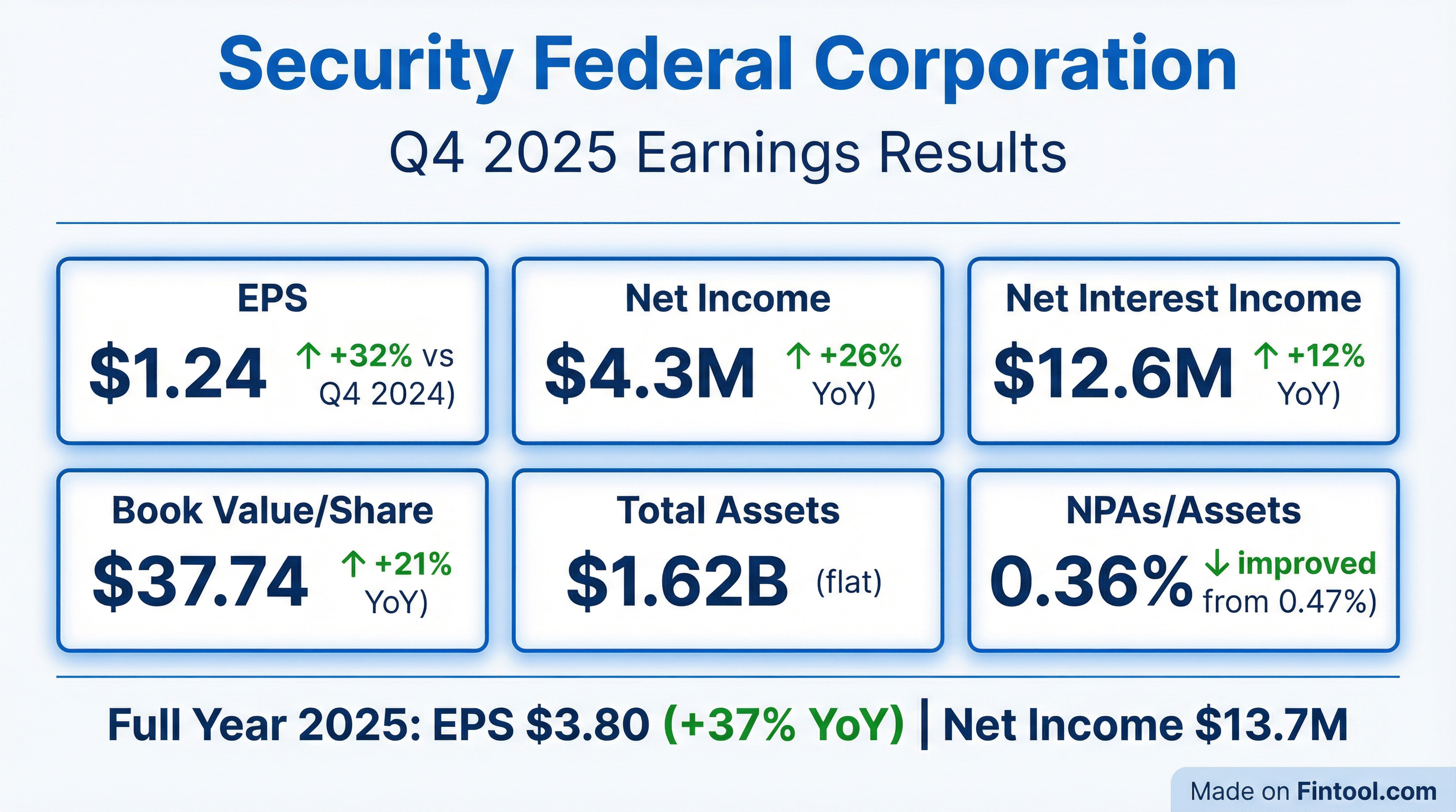 - Security Federal Corporation reported net income available to common shareholders of $3.9 million, or $1.24 per common share, for the fourth quarter ended December 31, 2025, an increase from $3.0 million, or $0.94 per common share, in the prior year quarter.
