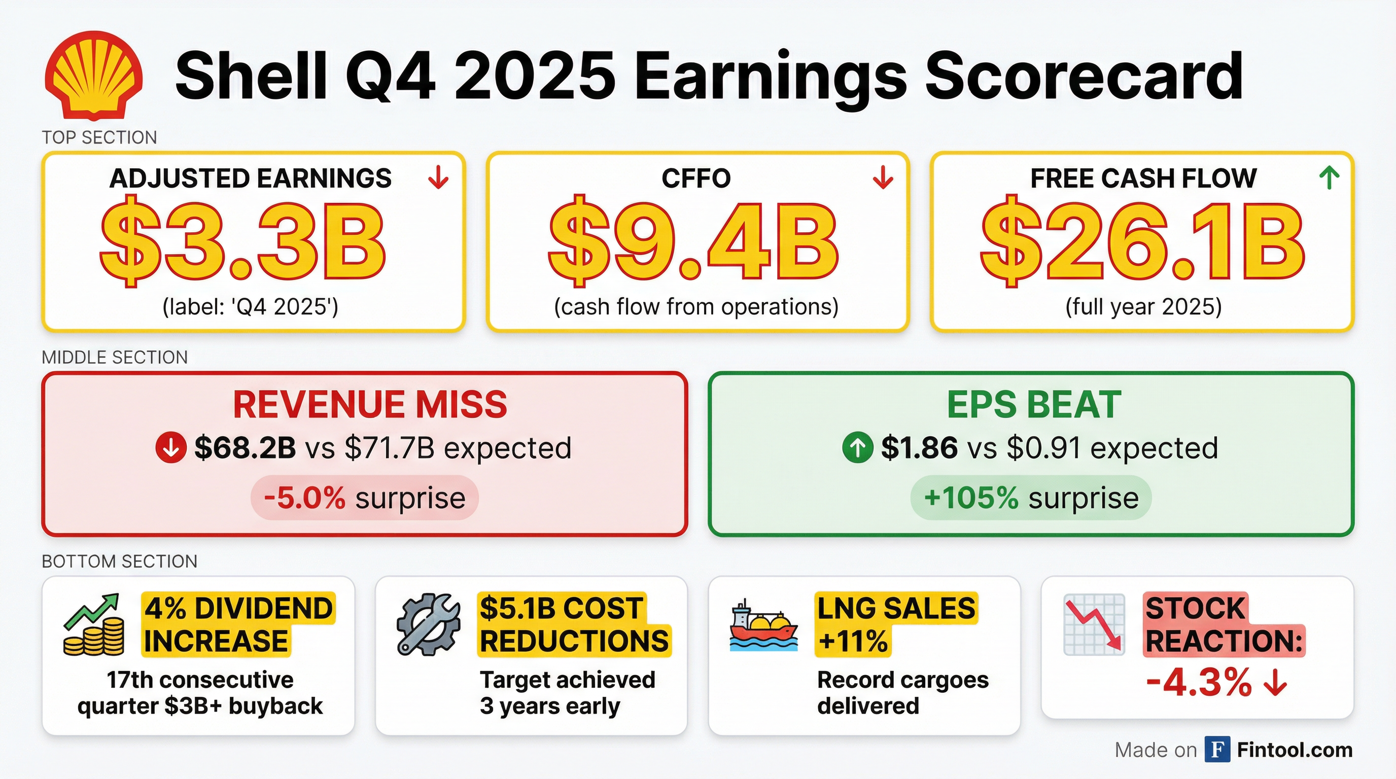 - Shell reported adjusted earnings of $3.3 billion for Q4 2025 and $18.5 billion for the full year 2025, with cash flow from operations (CFFO) of nearly $43 billion and free cash flow of over $26 billion for the full year.