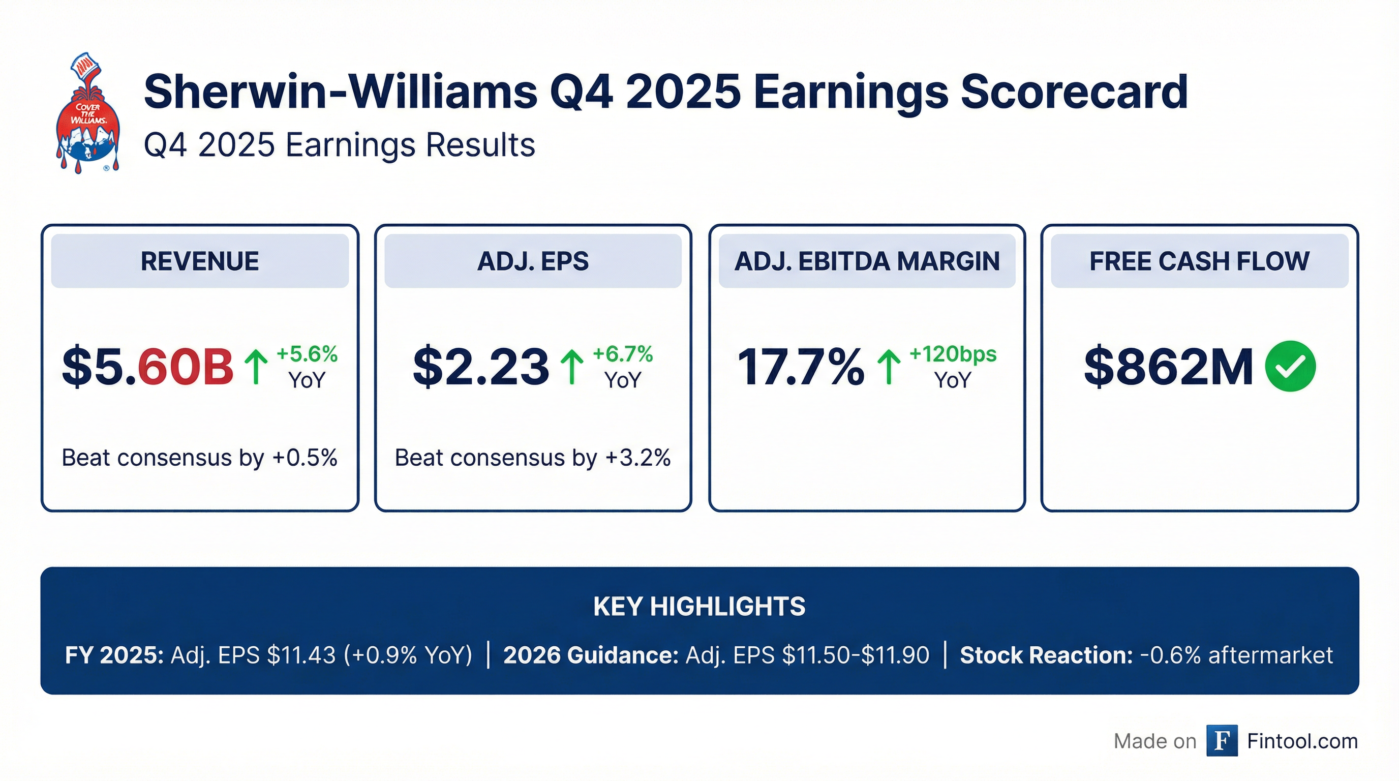 - Sherwin-Williams posted 4Q 2025 sales of $5.596 B, up 5.6% Y/Y, with gross margin at 48.5% (-10 bps) and SG&A at 34.6% of sales (-90 bps).