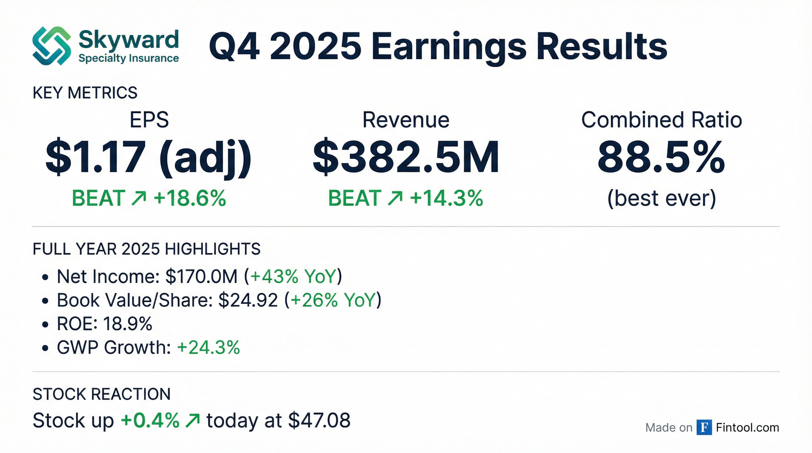 - Skyward Specialty Insurance Group reported strong Q4 2025 financial results, with adjusted operating income increasing 47% to $49 million and underwriting income reaching $41 million, both all-time highs. Gross written premiums grew 13% in the quarter, contributing to 24% growth for the full year. The combined ratio improved 7.3 points to 88.5% compared to the prior year quarter.
