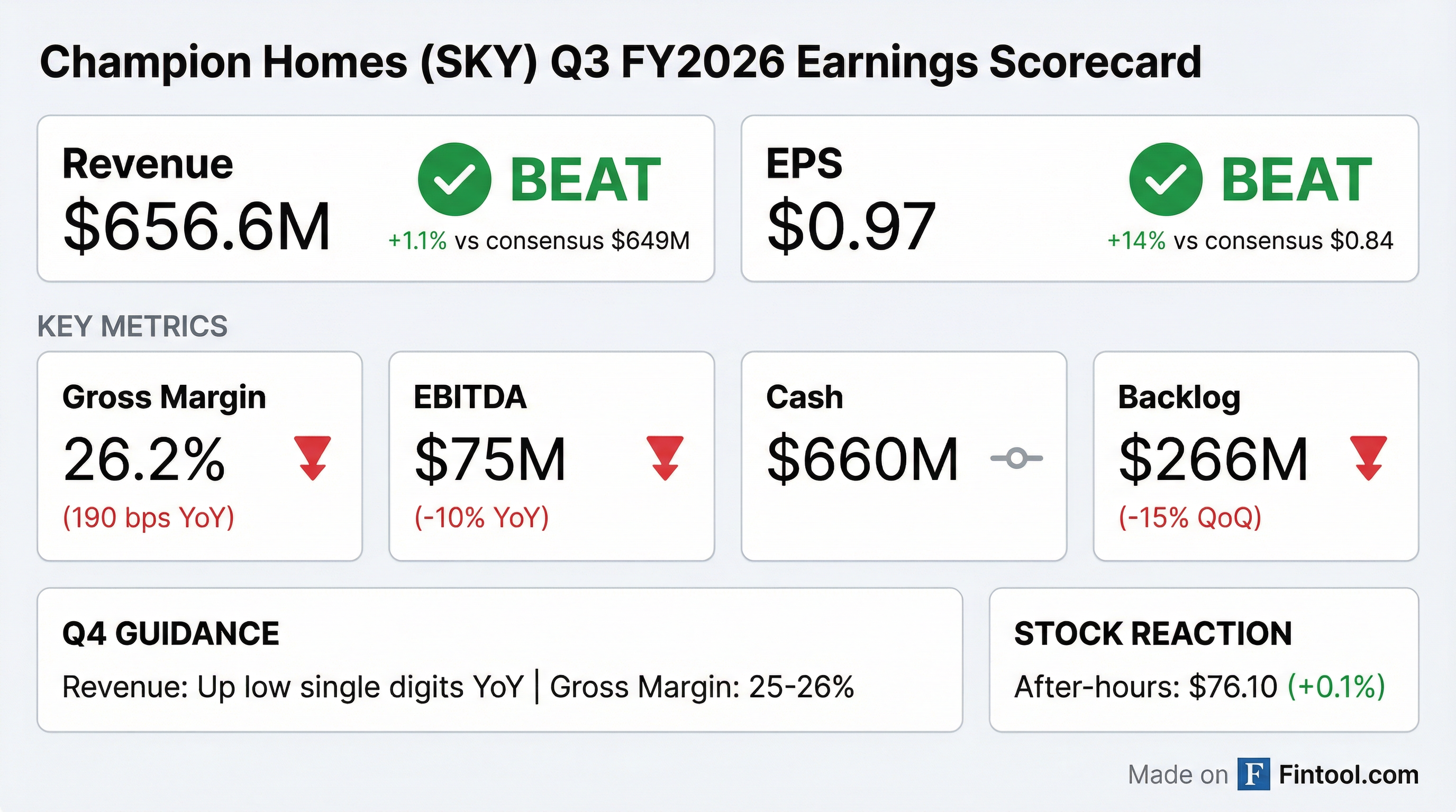 - Champion Homes reported Q3 2026 net sales of $657 million, a 2% increase year-over-year, with net income of $54 million and diluted EPS of $0.97, both down 12% from the prior year.