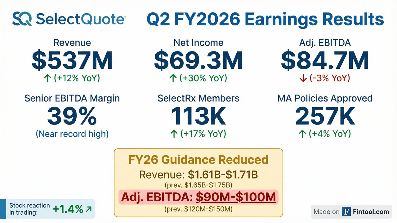 - SelectQuote, Inc. reported Q2 FY2026 consolidated revenue of $537.1 million, net income of $69.3 million, and Adjusted EBITDA of $84.7 million.