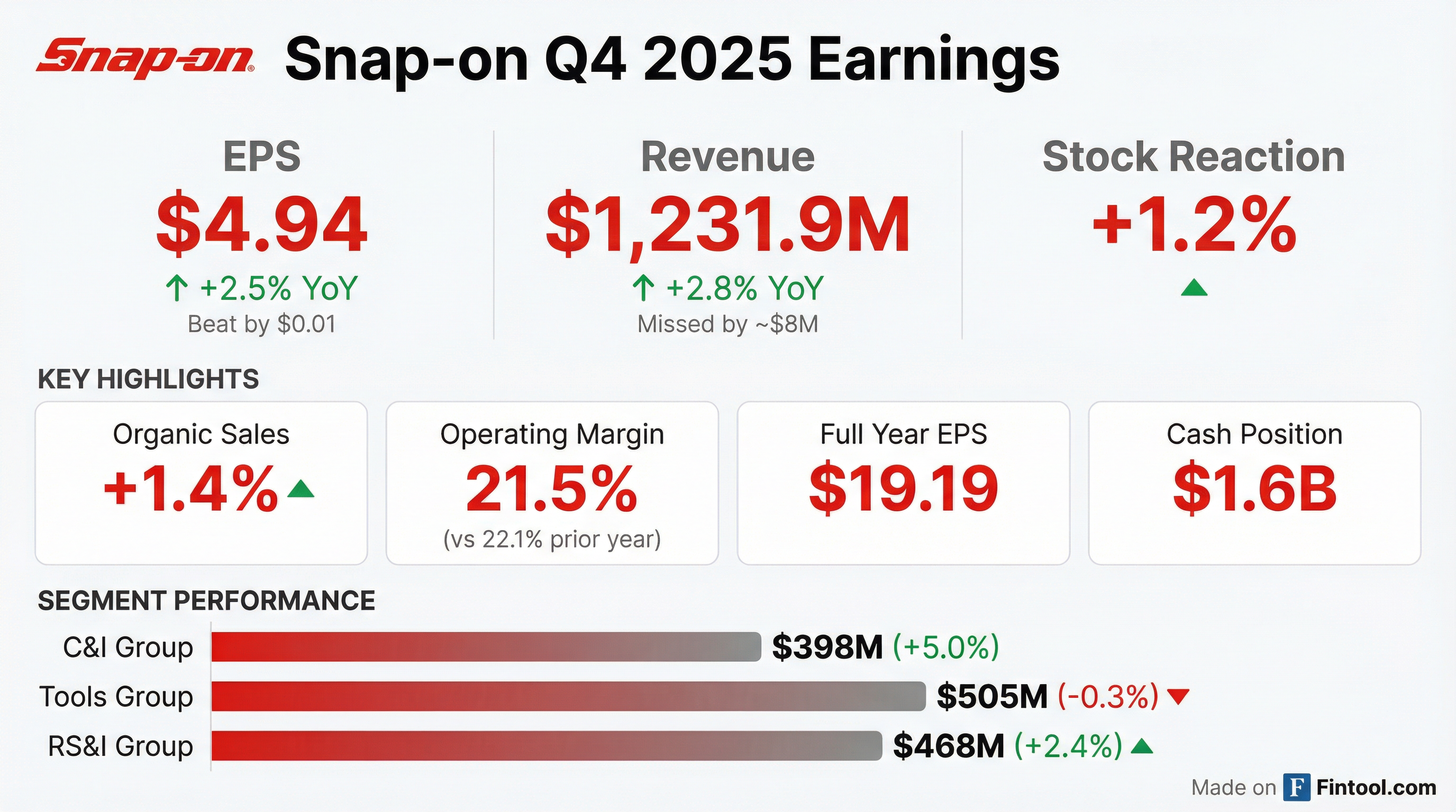 - Snap-on reported Q4 net sales of $1,231.9 million, up 2.8% YoY (organic +1.4%)