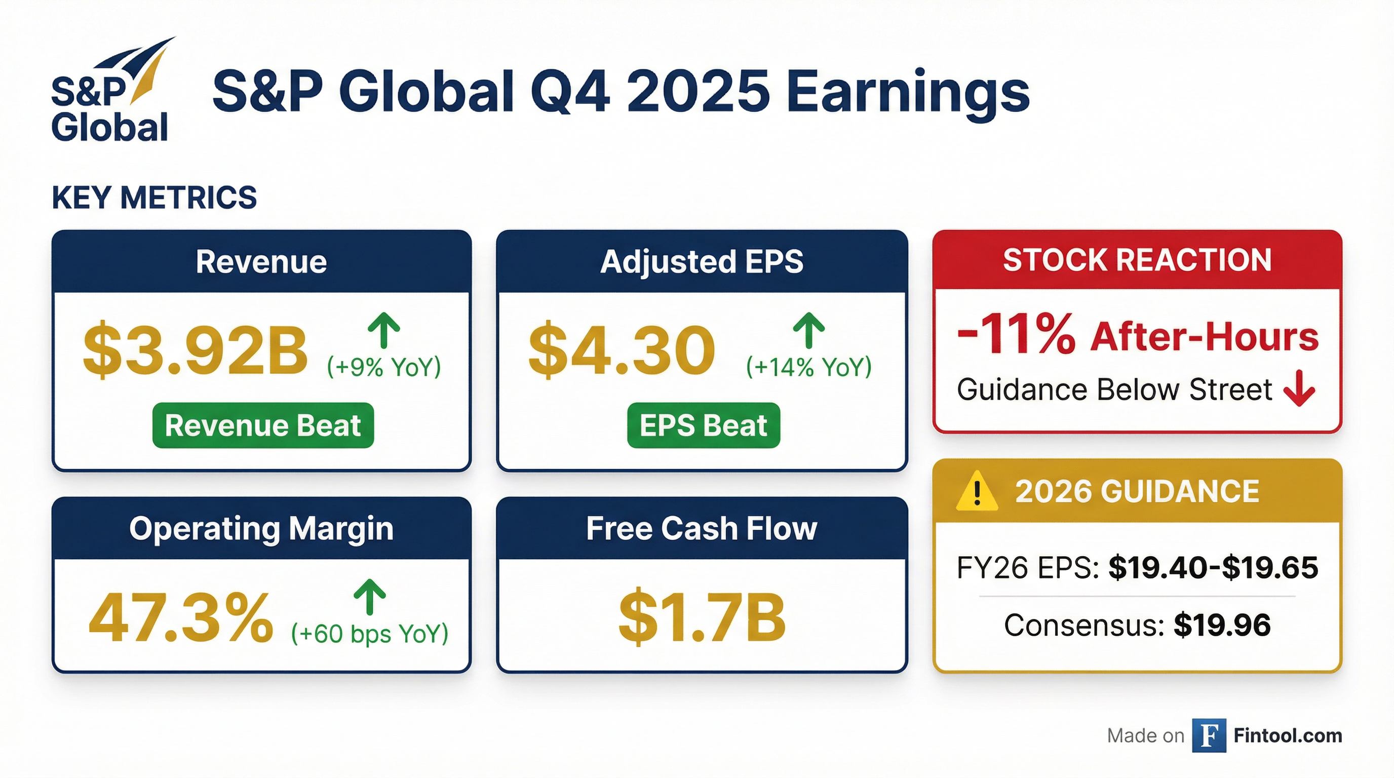 - S&P Global reported revenue of $3.916 billion in Q4 2025, up 9% y/y; operating profit rose 10% to $1.852 billion, with margin expanding 60 bps to 47.3%.