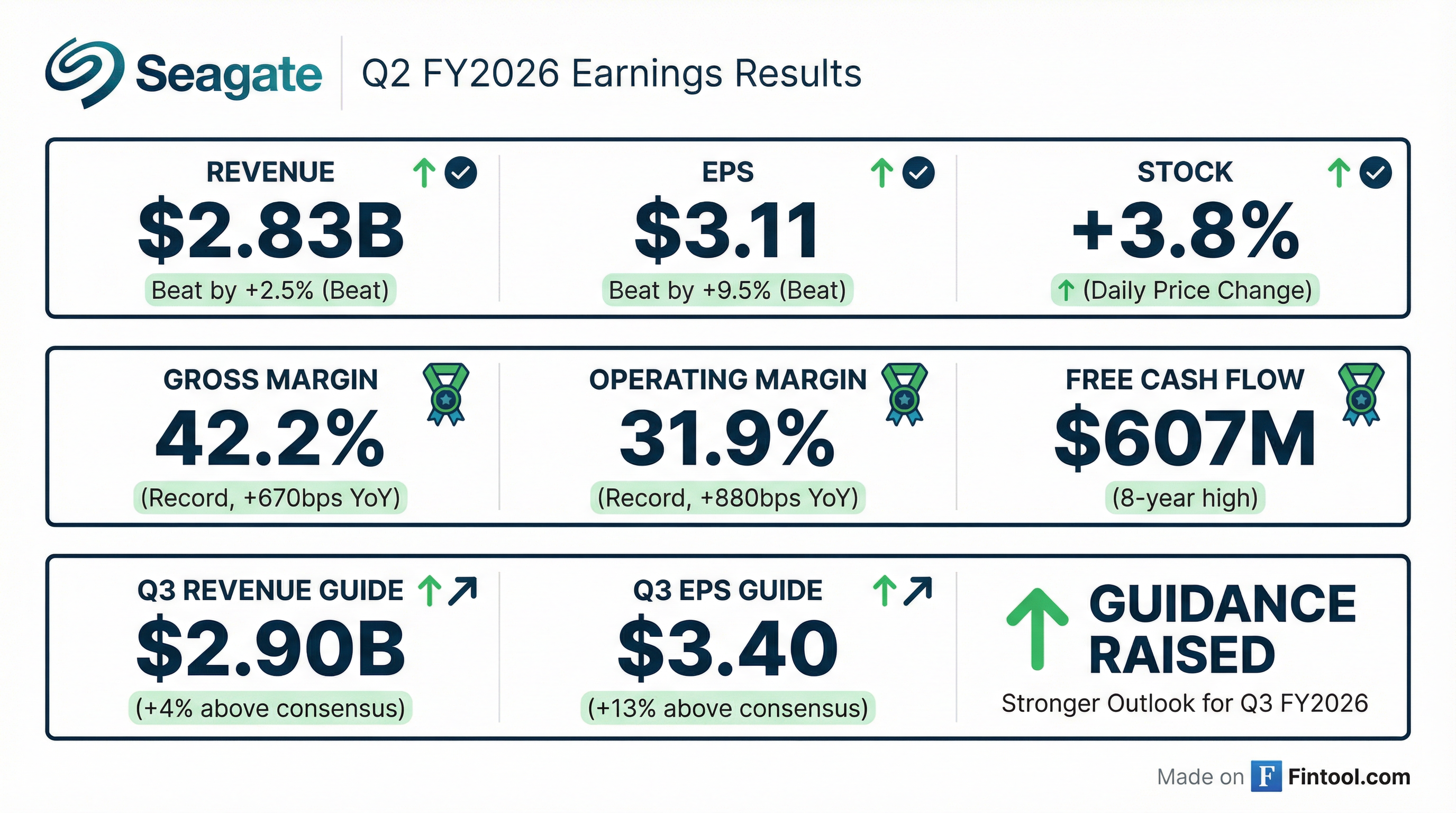 - Seagate reported Q2 revenue of $2.83 billion, up 7% sequentially and 22% year-over-year; non-GAAP gross margin was 42.2%, operating margin 31.9%, and EPS $3.11.