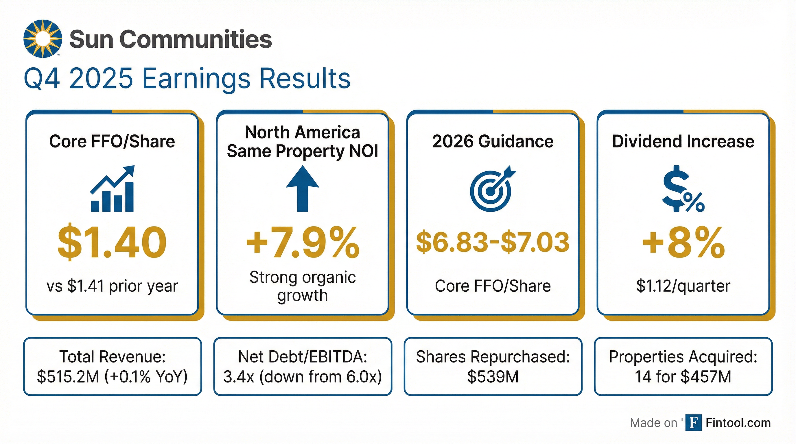 - Sun Communities reported Core FFO per share of $1.40 for Q4 2025 and $6.68 for the full year 2025, both exceeding the high end of their guidance ranges. North American same-property Net Operating Income (NOI) grew 7.9% for Q4 and 5.7% for the full year 2025.