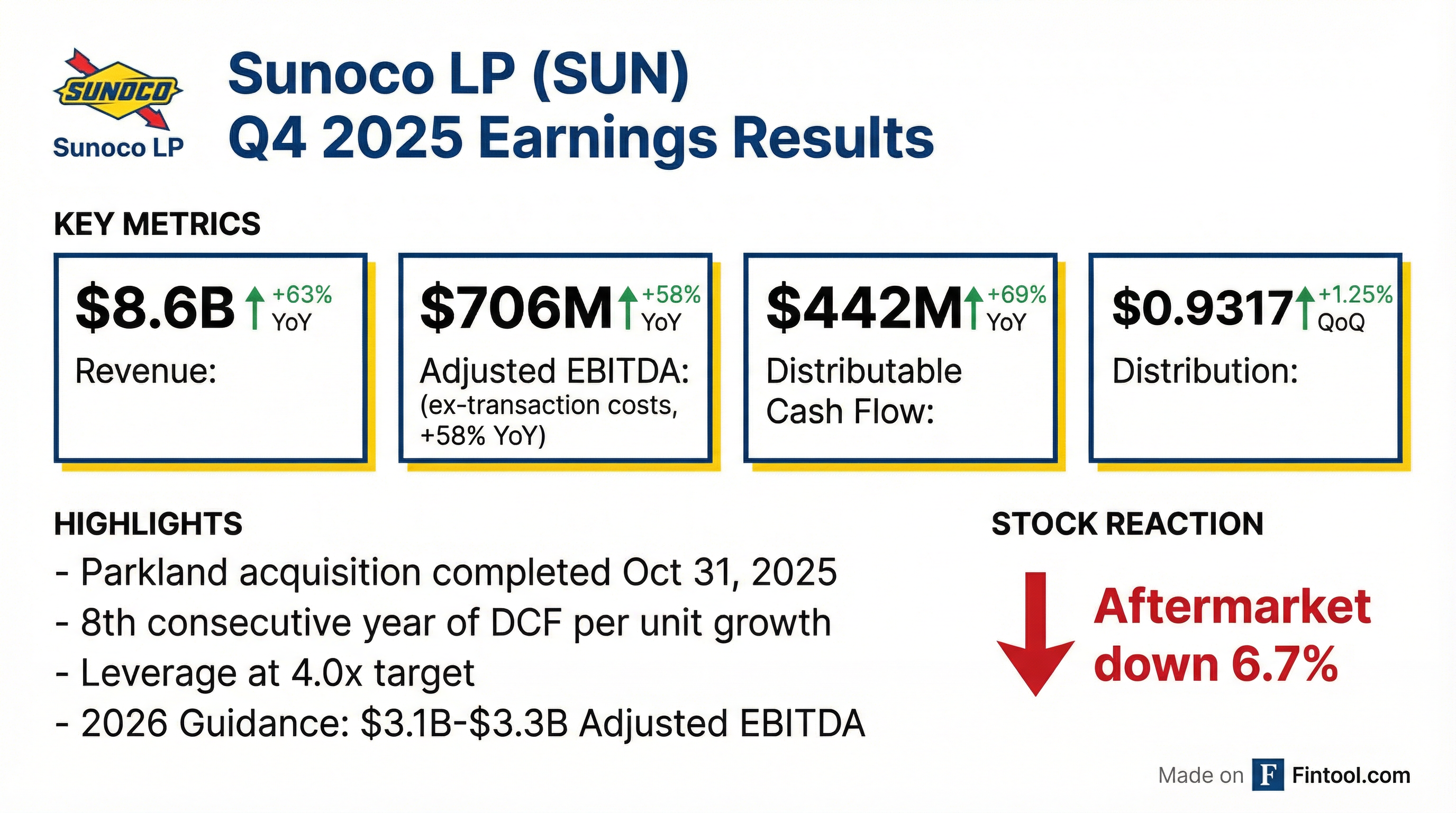 - Sunoco reported solid fourth quarter 2025 results, including net income of $97 million, Adjusted EBITDA of $706 million (excluding one-time transaction-related expenses), and Distributable Cash Flow, as adjusted, of $442 million.