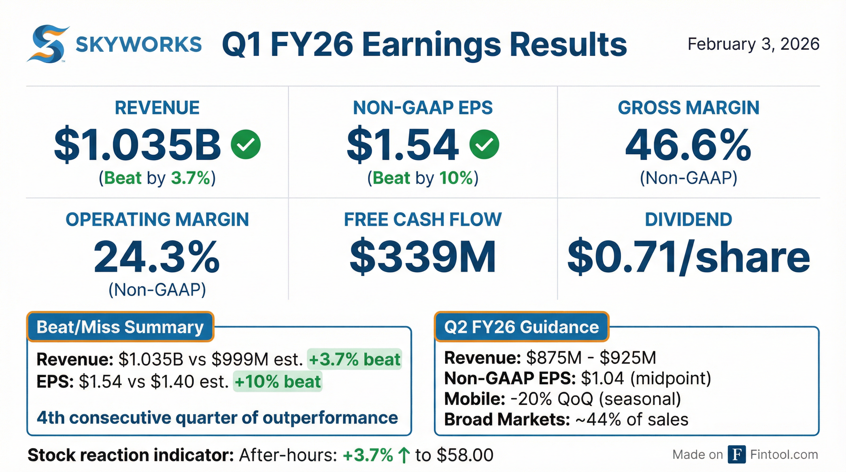 - Skyworks delivered $1.035 billion in revenue, $1.54 diluted EPS, $339 million in free cash flow, and paid $106 million in dividends in Q1 FY2026.