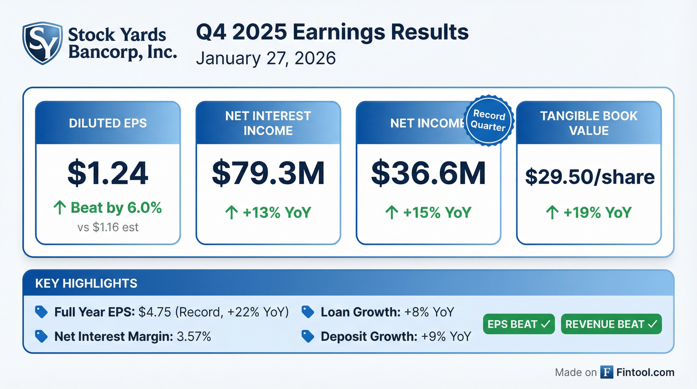 - Stock Yards Bancorp reported record earnings for the fourth quarter and full year ended December 31, 2025, with net income of $36.6 million or $1.24 per diluted share for Q4 2025, and $140.2 million or $4.75 per diluted share for the full year.