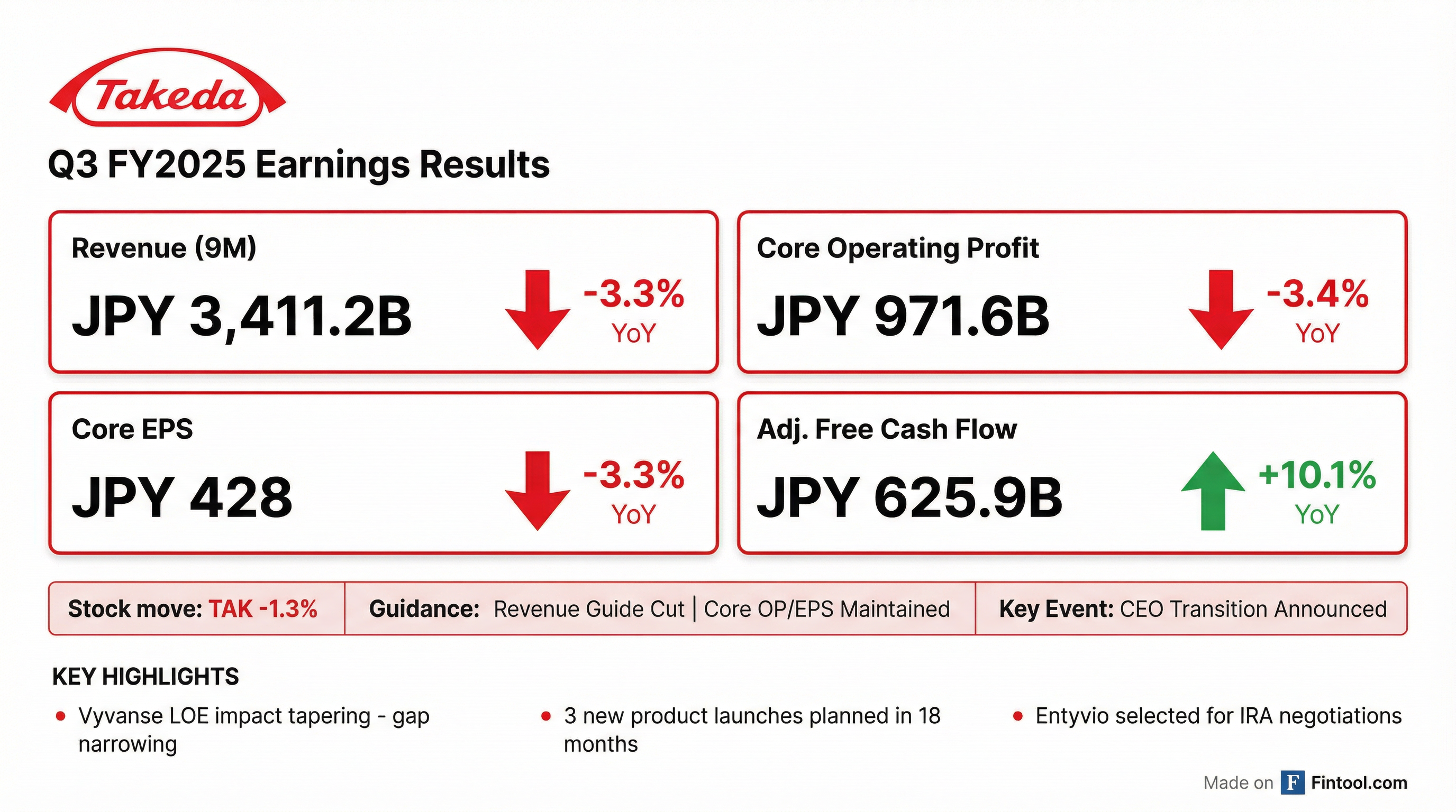 - Takeda reported Q3 FY2025 year-to-date revenue of just over JPY 3.4 trillion, a 3.3% decrease, and Core Operating Profit of JPY 971.6 billion, a 3.4% decrease.