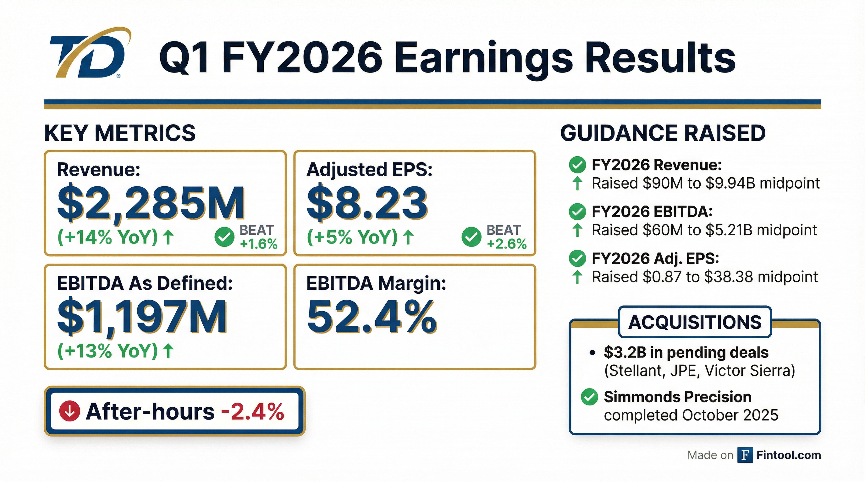 • TransDigm delivered net sales of $2,285 million, up 14% year-over-year, with net income of $445 million and GAAP EPS of $6.62; adjusted EPS rose to $8.23 from $7.83 in Q1 2025.
