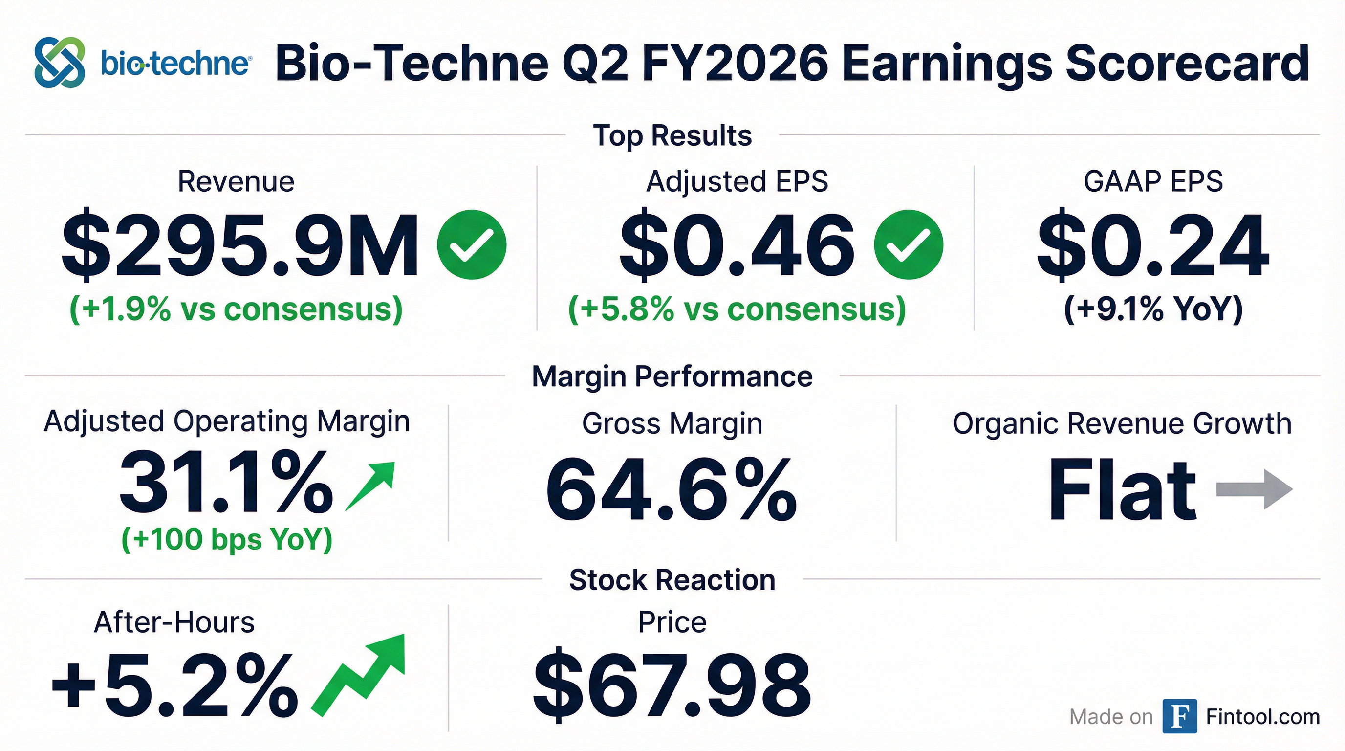 - Bio-Techne reported total Q2 revenue of $295.9 million, flat y/y, with 4% organic growth excluding timing impacts from two large cell therapy customers.