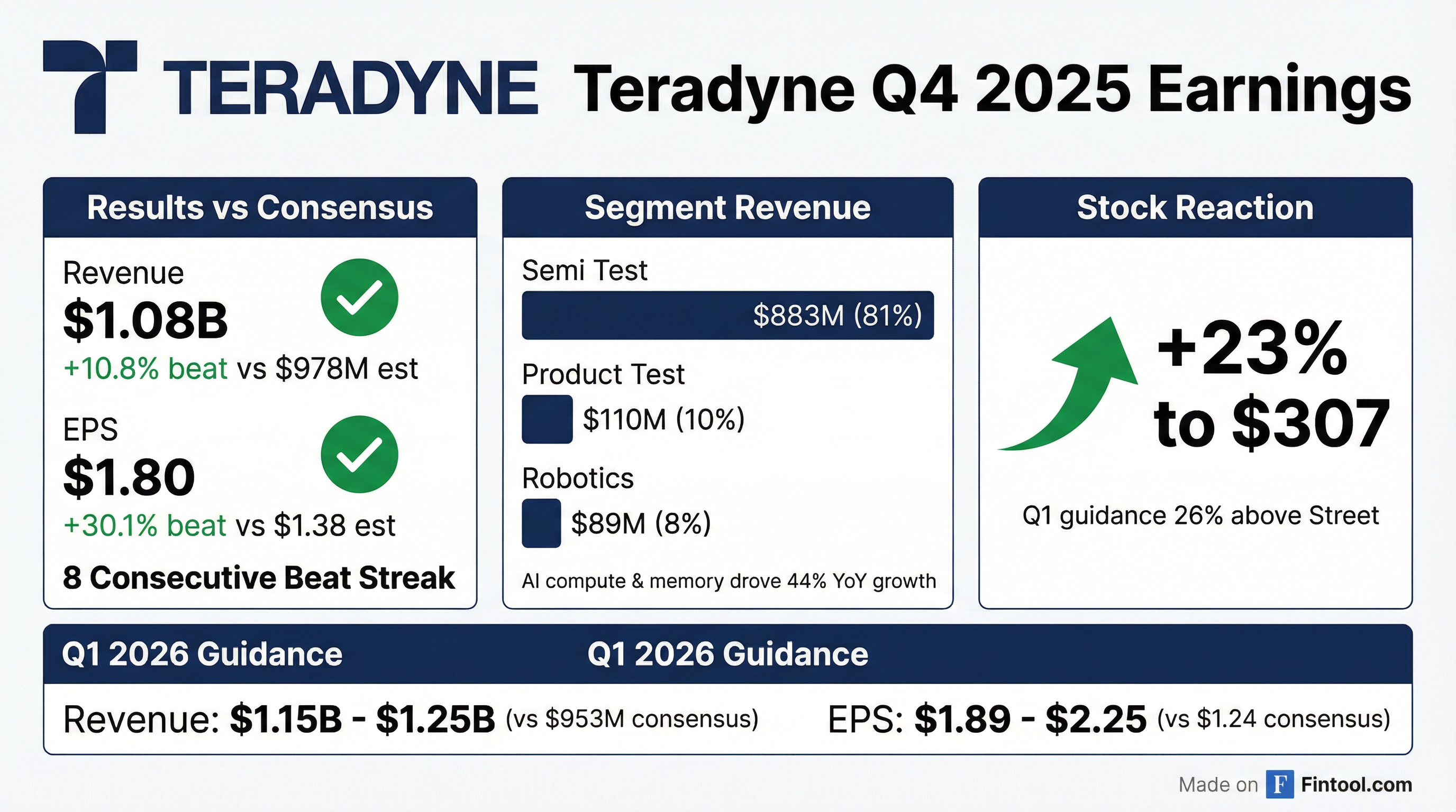 - Teradyne achieved Q4’25 revenue of $1.083 billion, up 44% year-over-year, led by strong AI-related demand in compute and memory.