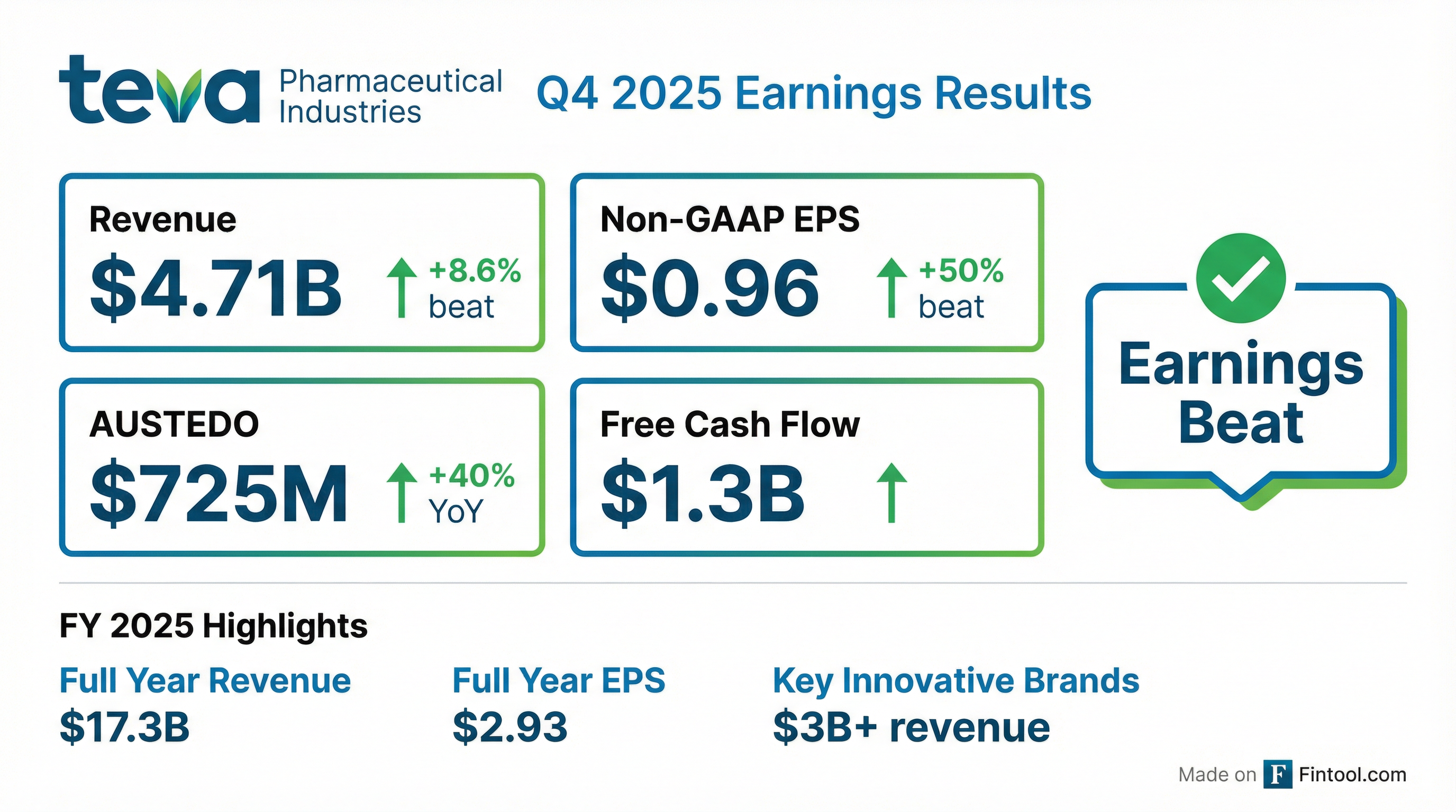 - Teva reported Q4 2025 revenue of approximately $4.2 billion and non-GAAP EPS of $0.68. For the full year 2025, EBITDA grew 12% to $5.3 billion, EPS grew 19% to $2.93, and free cash flow was $2.4 billion including milestone payments.