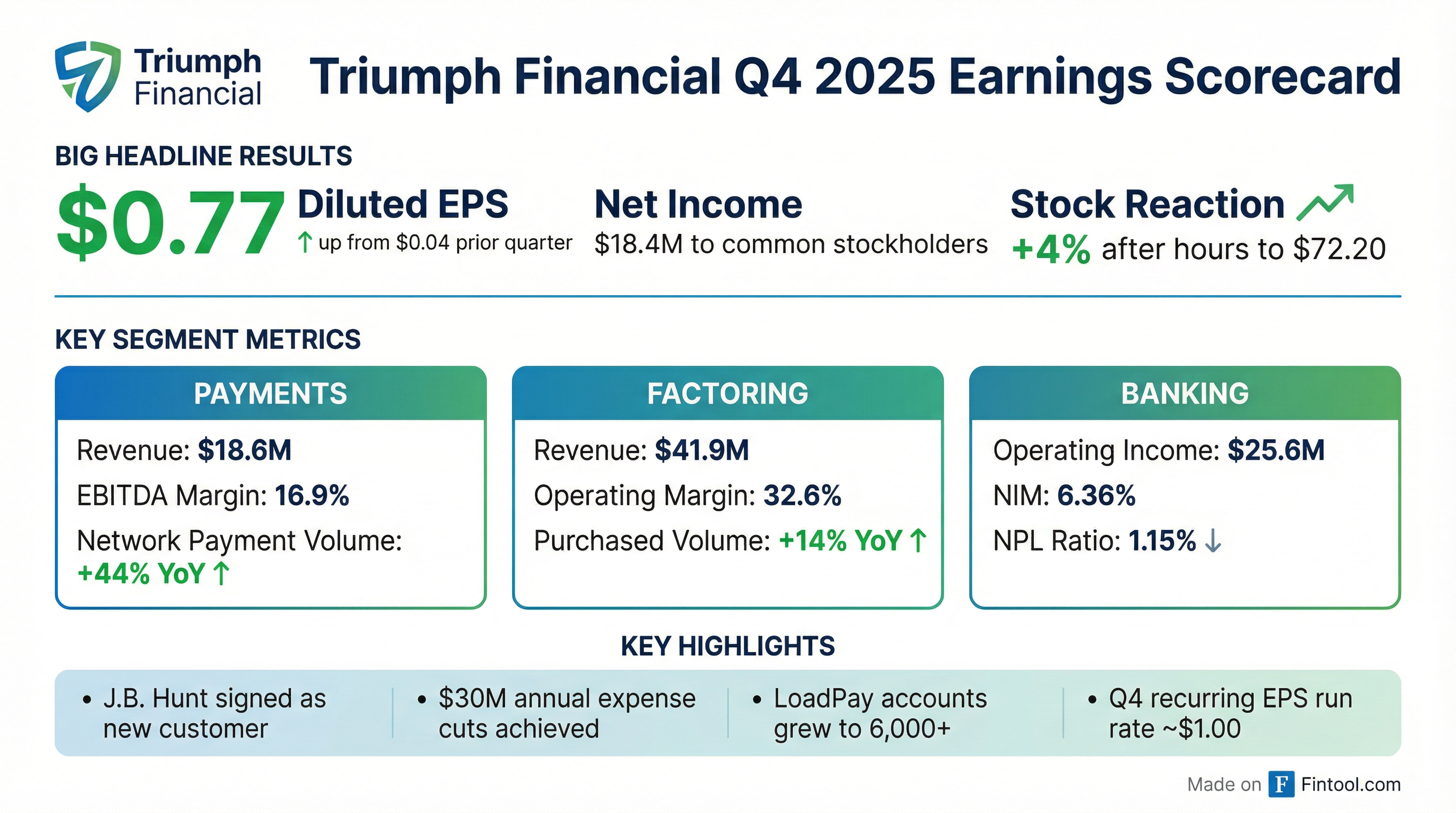 • Triumph Financial, Inc. recorded net income to common stockholders of $18.4 million, or $0.77 per diluted share, for the fourth quarter of 2025.