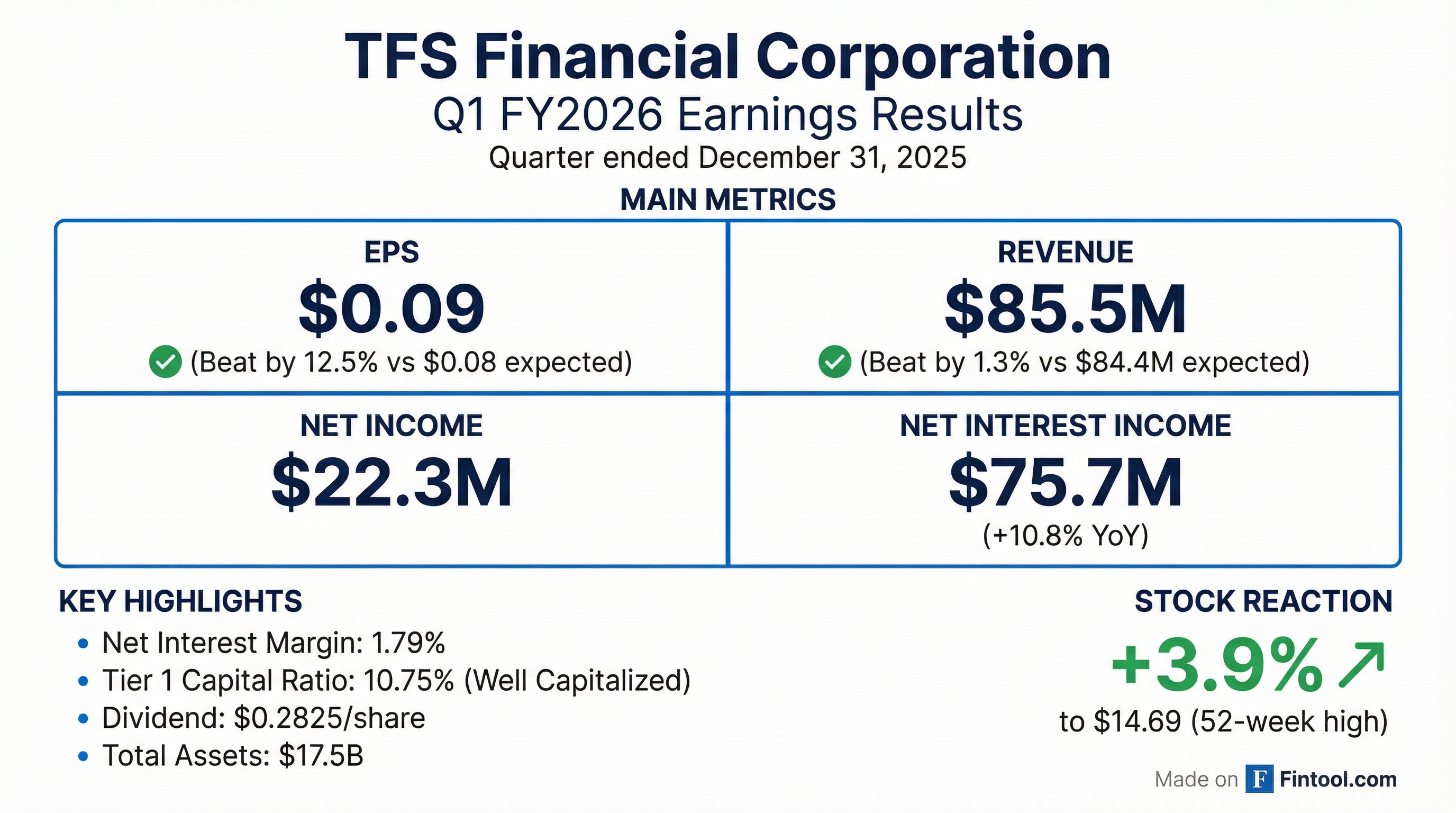 • TFS Financial reported record net income of $91.0 million for the fiscal year ended September 30, 2025, representing a 14.3% increase compared to the prior fiscal year.