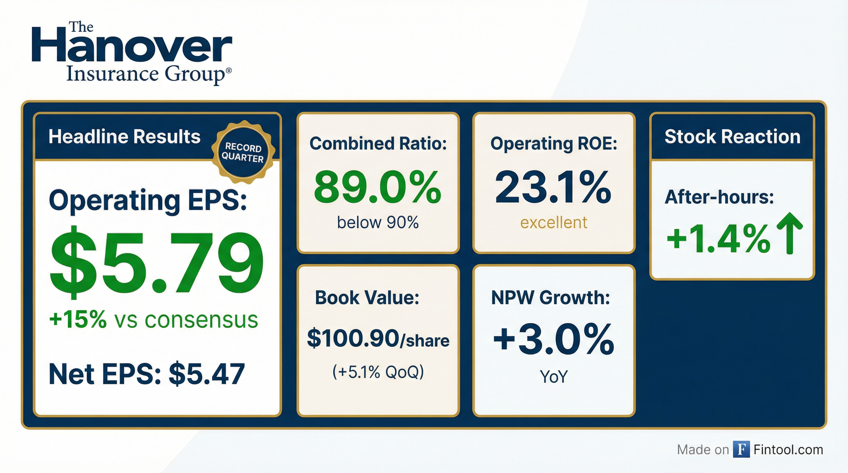 - The Hanover Insurance Group reported record quarterly operating earnings per share and an all-time high operating return on equity of 20% for the full year 2025. The Q4 2025 combined ratio was 89%, with the full-year combined ratio at 91.6%, improving over three points year-over-year.