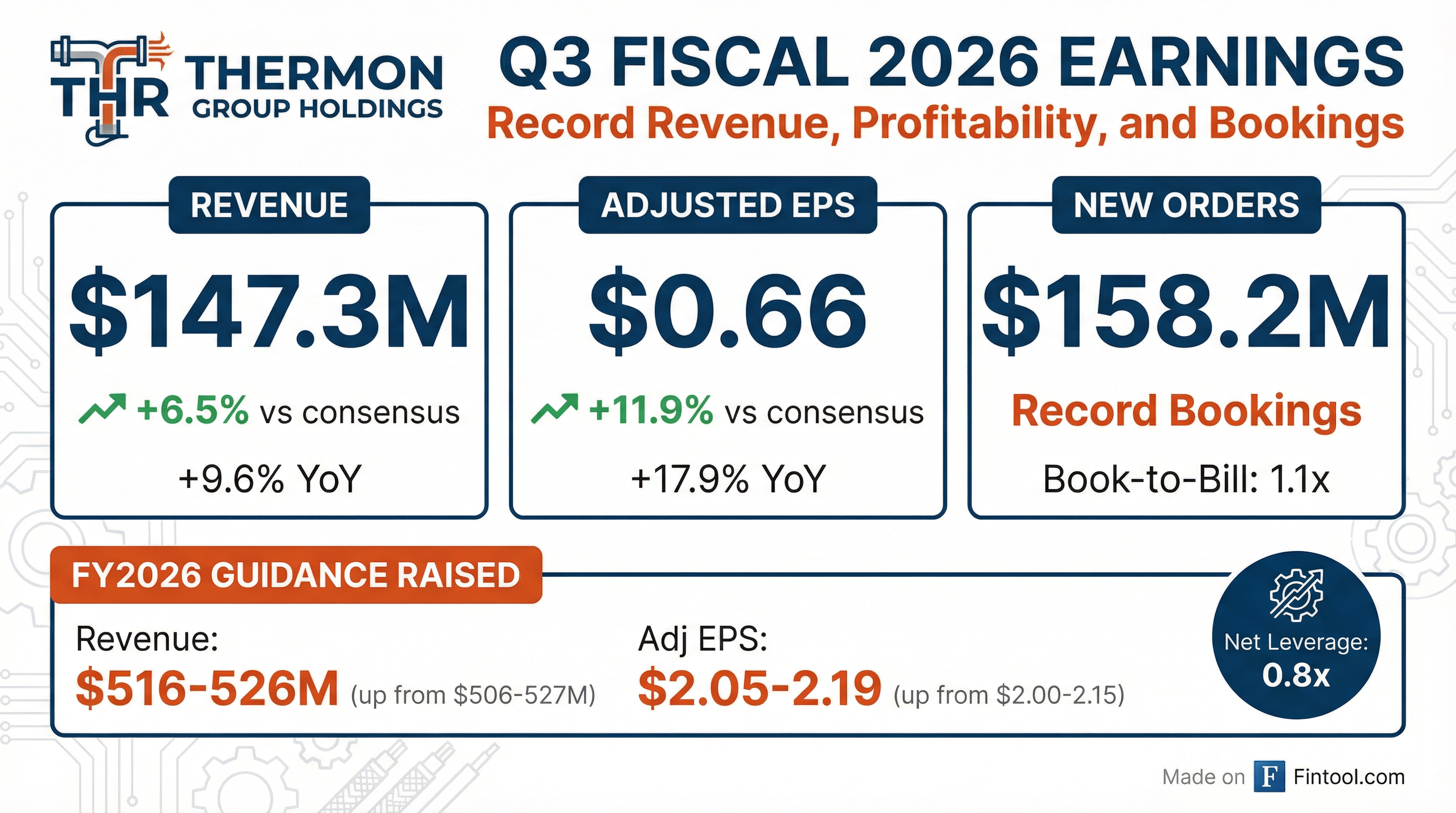 - Thermon Group Holdings achieved record-breaking Q3 fiscal 2026 results, with revenue up 10% year-over-year to $147.3 million, adjusted EBITDA up 12% to $35.6 million, and adjusted EPS up 18% to $0.66.