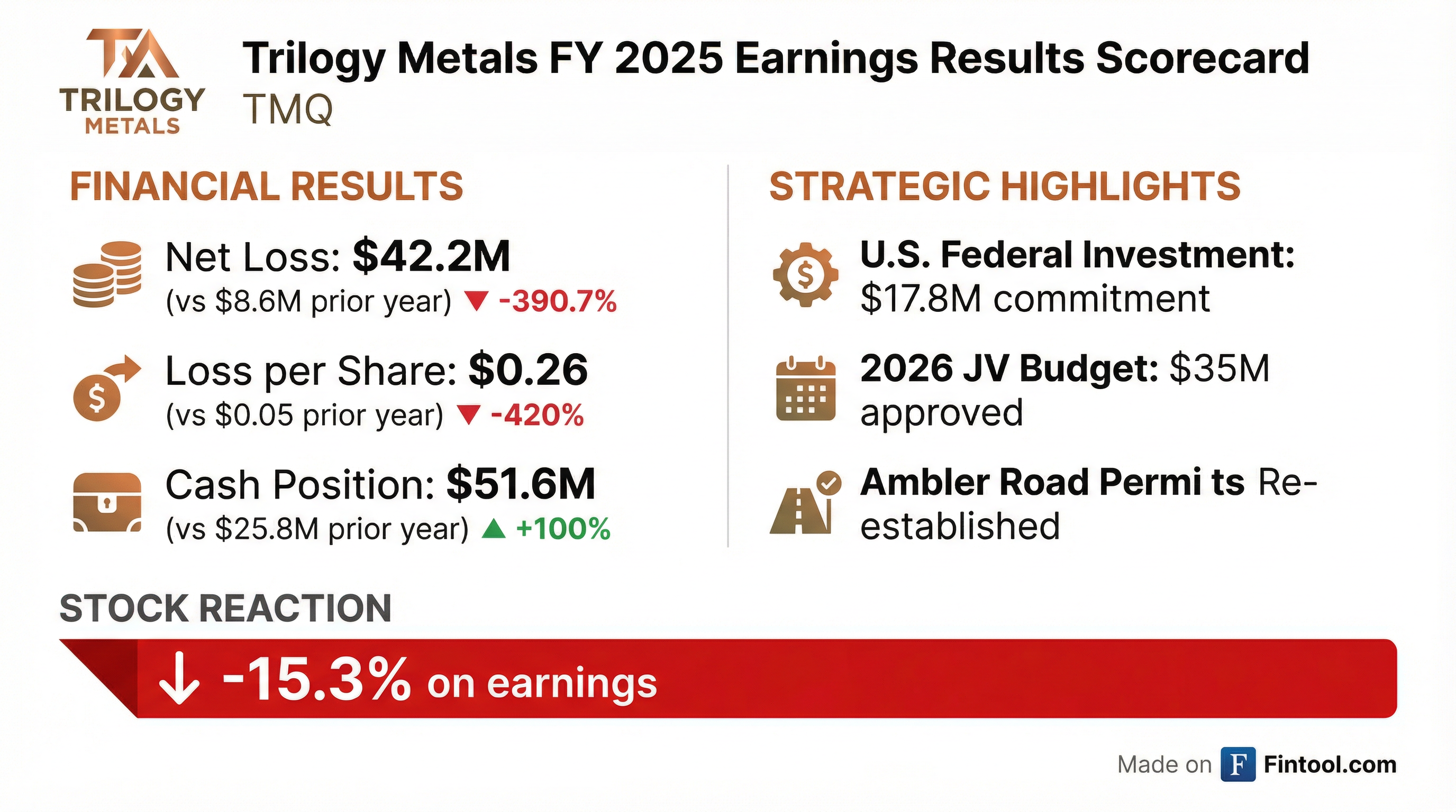 - Trilogy Metals reported its financial results for the year ended November 30, 2025, with a net loss of $42.2 million (or $0.26 basic and diluted loss per common share) and a strong cash balance of $51.6 million.