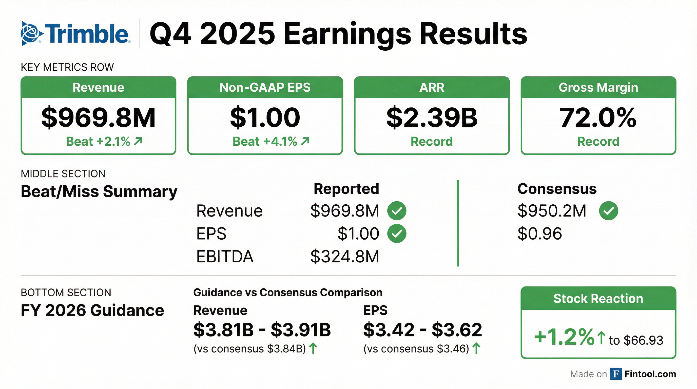 - Trimble delivered Q4 revenue of $970 million (+9% YoY) and full-year revenue of $3.57 billion (+10%), with ARR of $2.39 billion (+14%), Q4 EPS of $1.00, and FY EPS of $3.13.