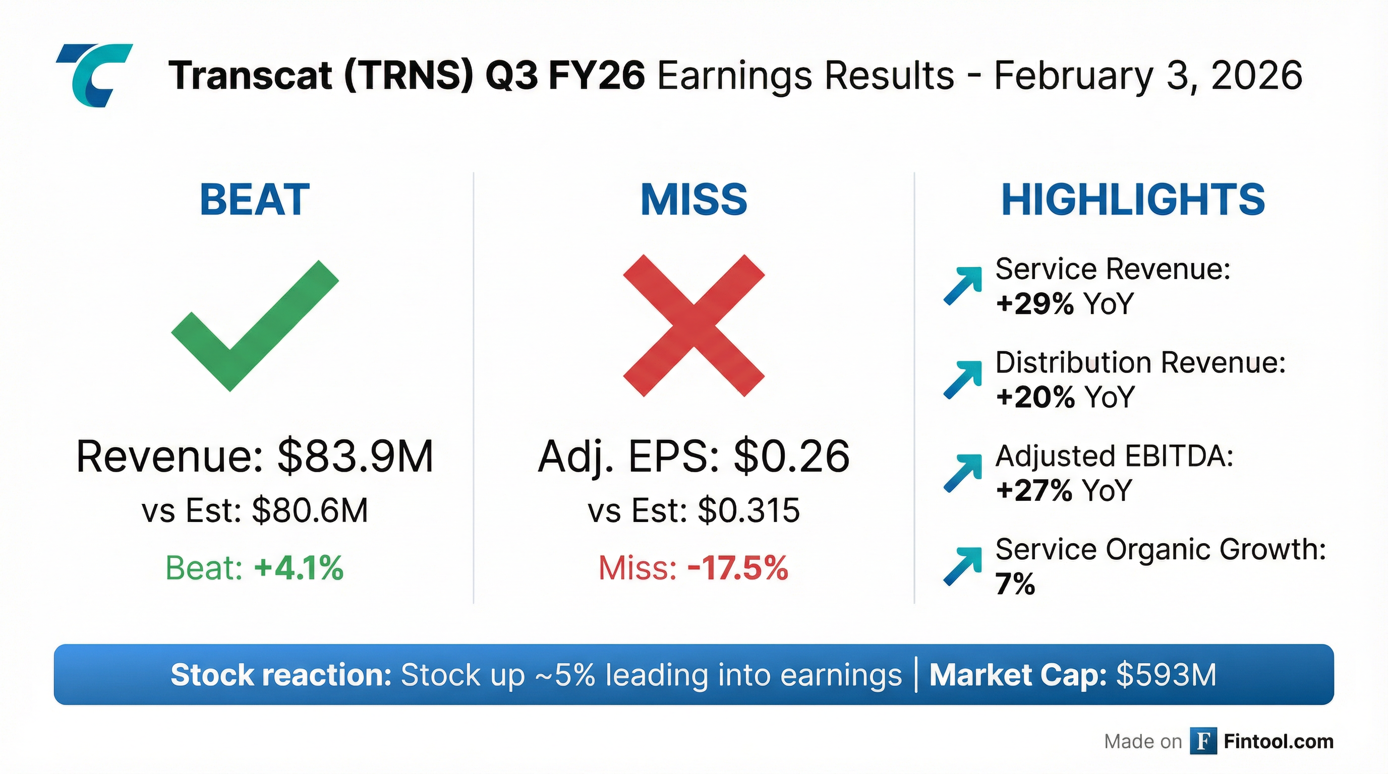 - Transcat reported Q3 Fiscal 2026 revenue of $83.9 million, a 26% increase year-over-year, driven by 29% growth in Service revenue and 20% growth in Distribution revenue.