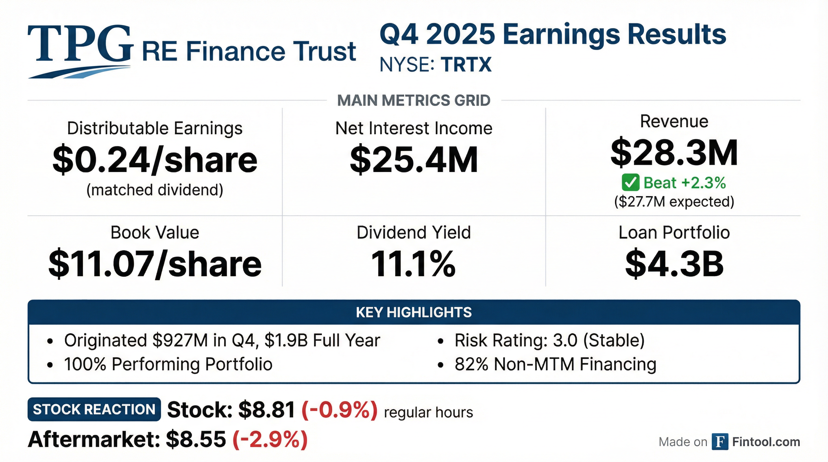 - For Q3 2025, TPG RE Finance Trust (TRTX) reported GAAP net income of $18.4 million, or $0.23 per common share, and distributable earnings of $19.9 million, or $0.25 per common share, covering its quarterly dividend. Book value per common share increased quarter over quarter to $11.25.