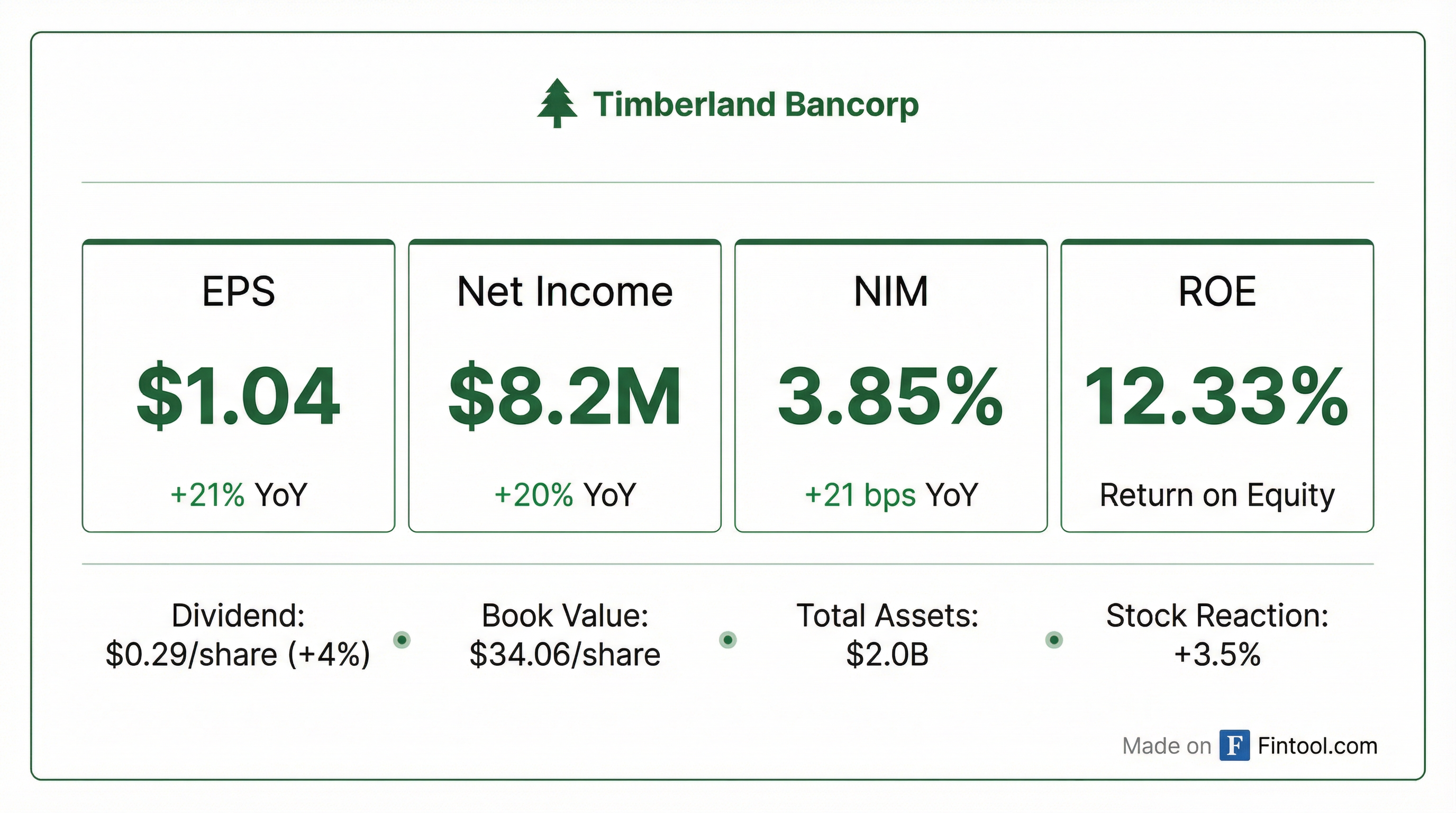 - Timberland Bancorp, Inc. reported net income of $8.22 million and diluted earnings per share (EPS) of $1.04 for the quarter ended December 31, 2025, representing a 20% increase in net income and a 21% increase in EPS compared to the same quarter last year.