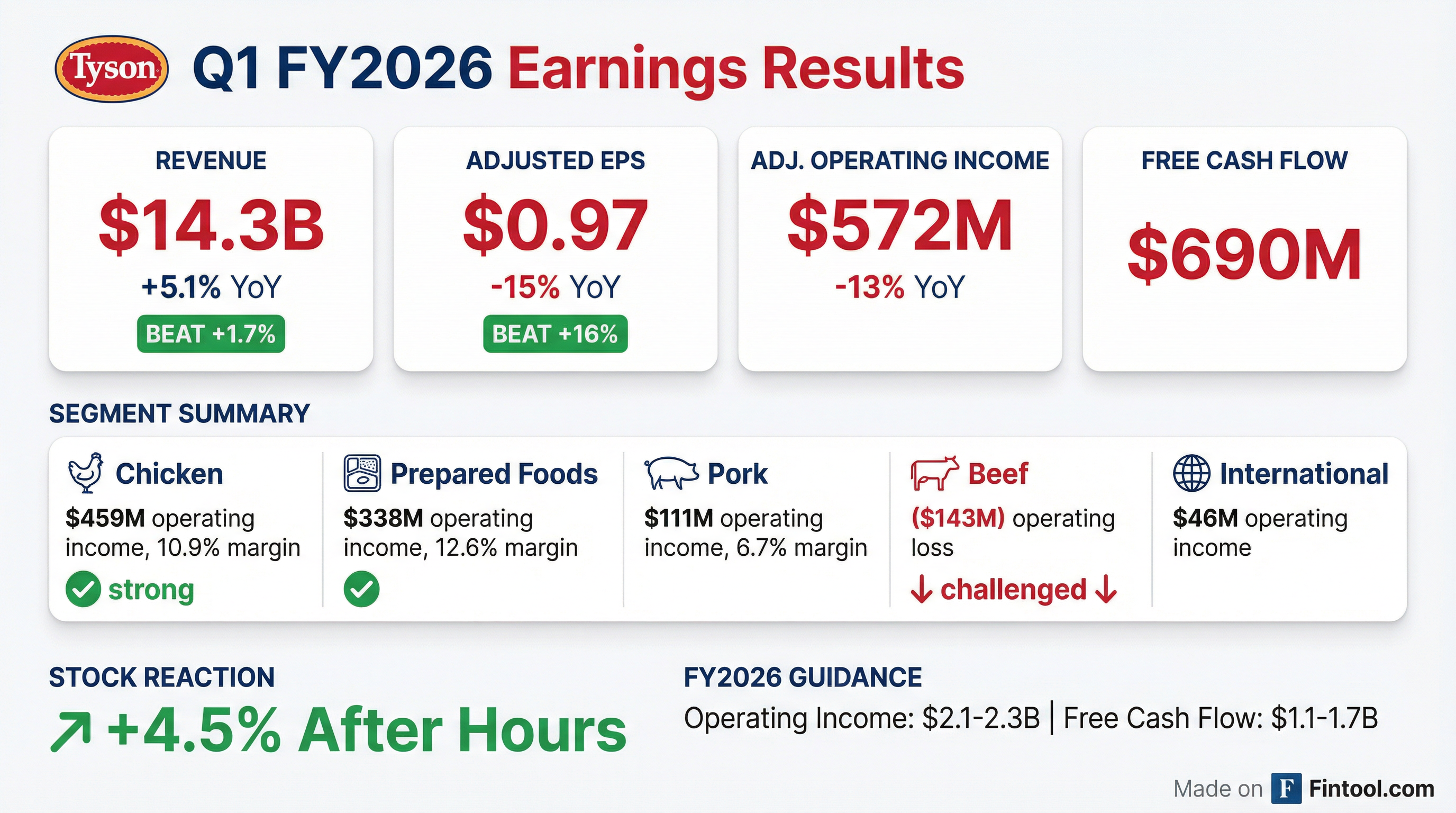- For FY2026, Tyson expects sales growth of 2–4%, adjusted operating income of $2.1–2.3 billion, and free cash flow of $1.1–1.7 billion.