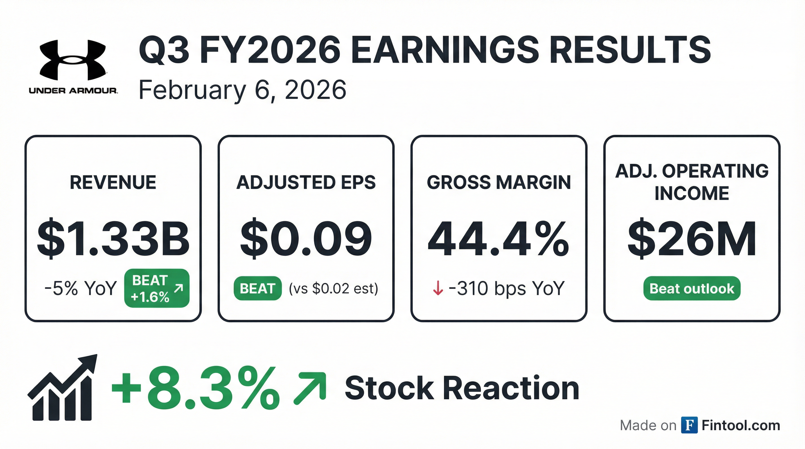 - Under Armour reported a 5% decline in revenue to $1.3 billion for Q2 2026, with an adjusted diluted earnings per share of $0.04. Inventory decreased 6% year-over-year to $1 billion.