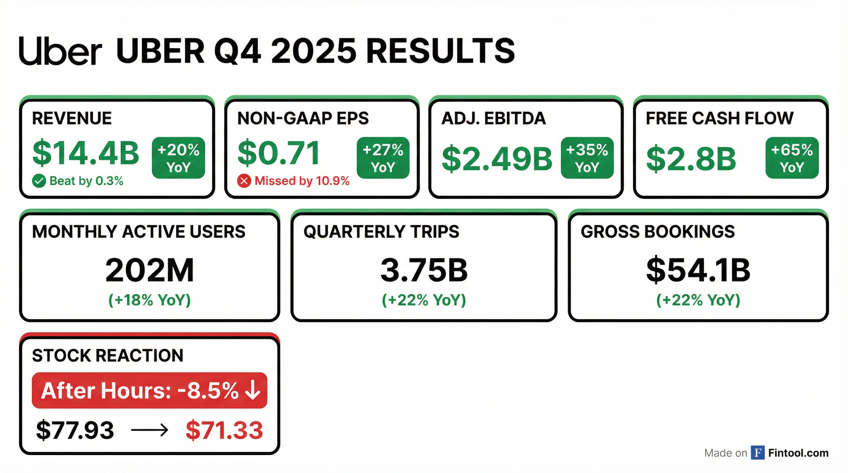 - Uber delivered a record Q4 with GAAP operating income of $1.8 B and adjusted EBITDA of $2.5 B (up 35% YoY), on $54.1 B gross bookings (+22% YoY) and $14.4 B revenue (+20% YoY).