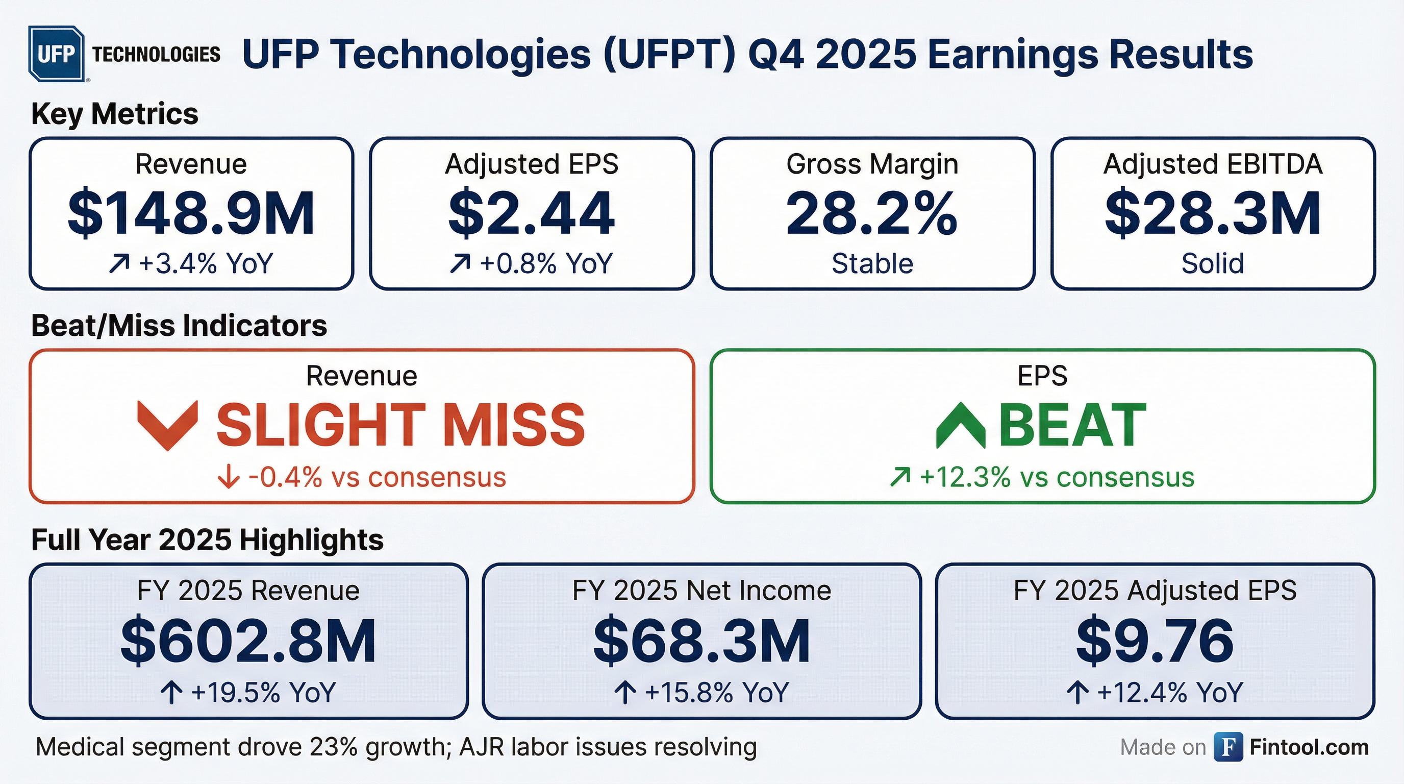 - UFP Technologies reported strong 2025 financial results, with sales growing 19.5% to $602.8 million for the full year, and EPS increasing 15.4% despite absorbing $6.3 million in labor inefficiencies.