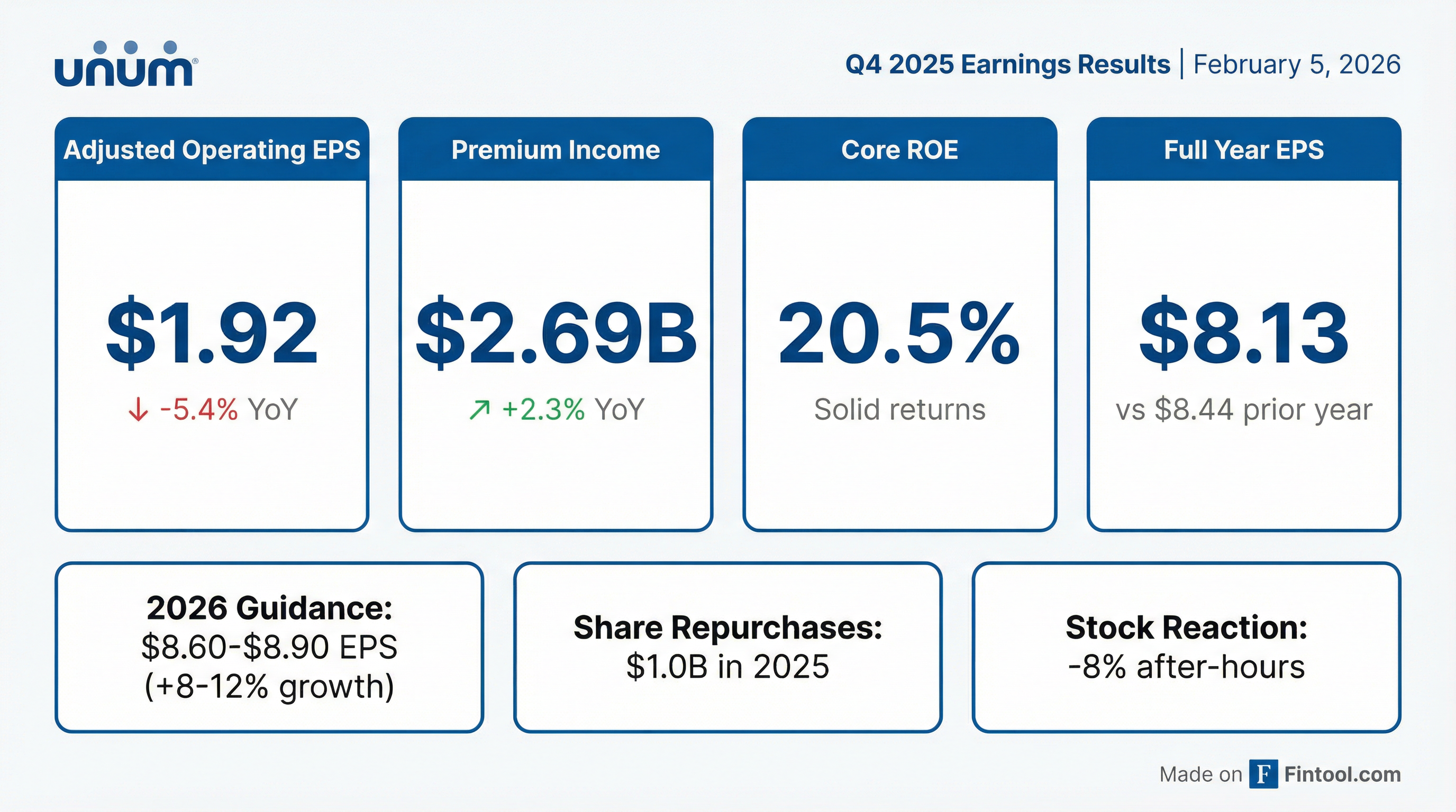 - Unum Group reported adjusted EPS of $8.13 for full year 2025, which was down year-over-year and below expectations, primarily due to higher than expected benefits experience.