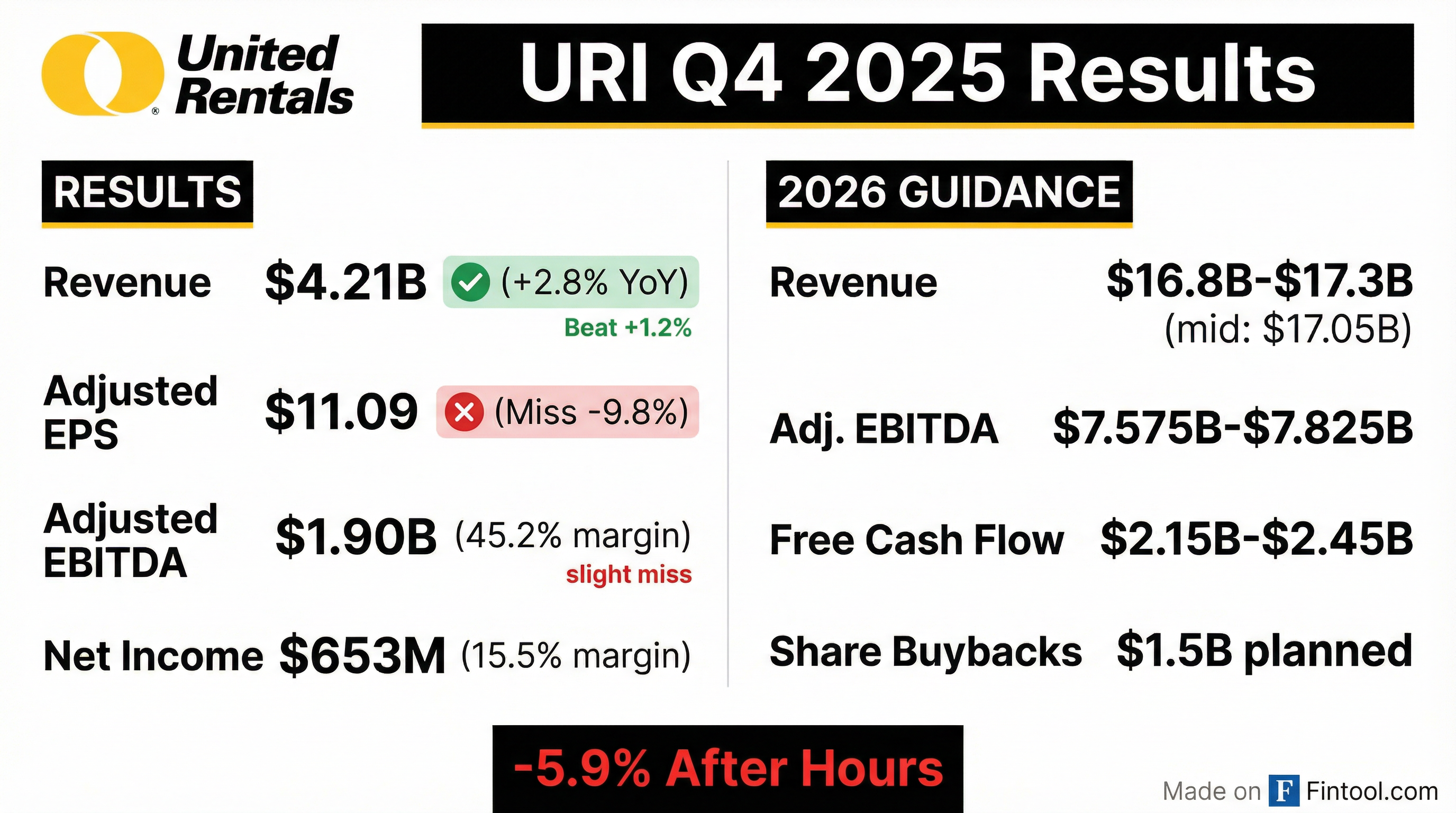 - United Rentals delivered Q4 revenue of $4.2 billion (+2.8% y/y) and rental revenue of $3.58 billion (+4.6%), generating adjusted EBITDA of $1.901 billion (45.2% margin) and adjusted EPS of $11.09.