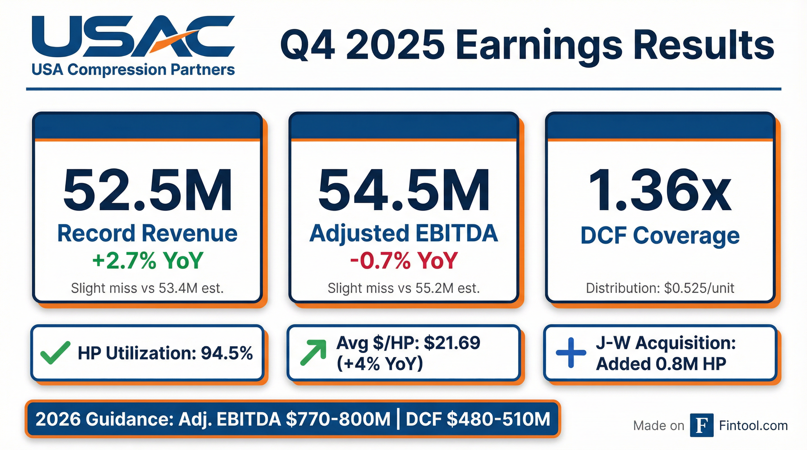 - USA Compression reported record Q4 2025 revenue of $252.5 million and full-year 2025 revenue near $998.1 million, achieving all-time high distributable cash flow, though it missed Q4 GAAP EPS of $0.22 and revenue expectations.