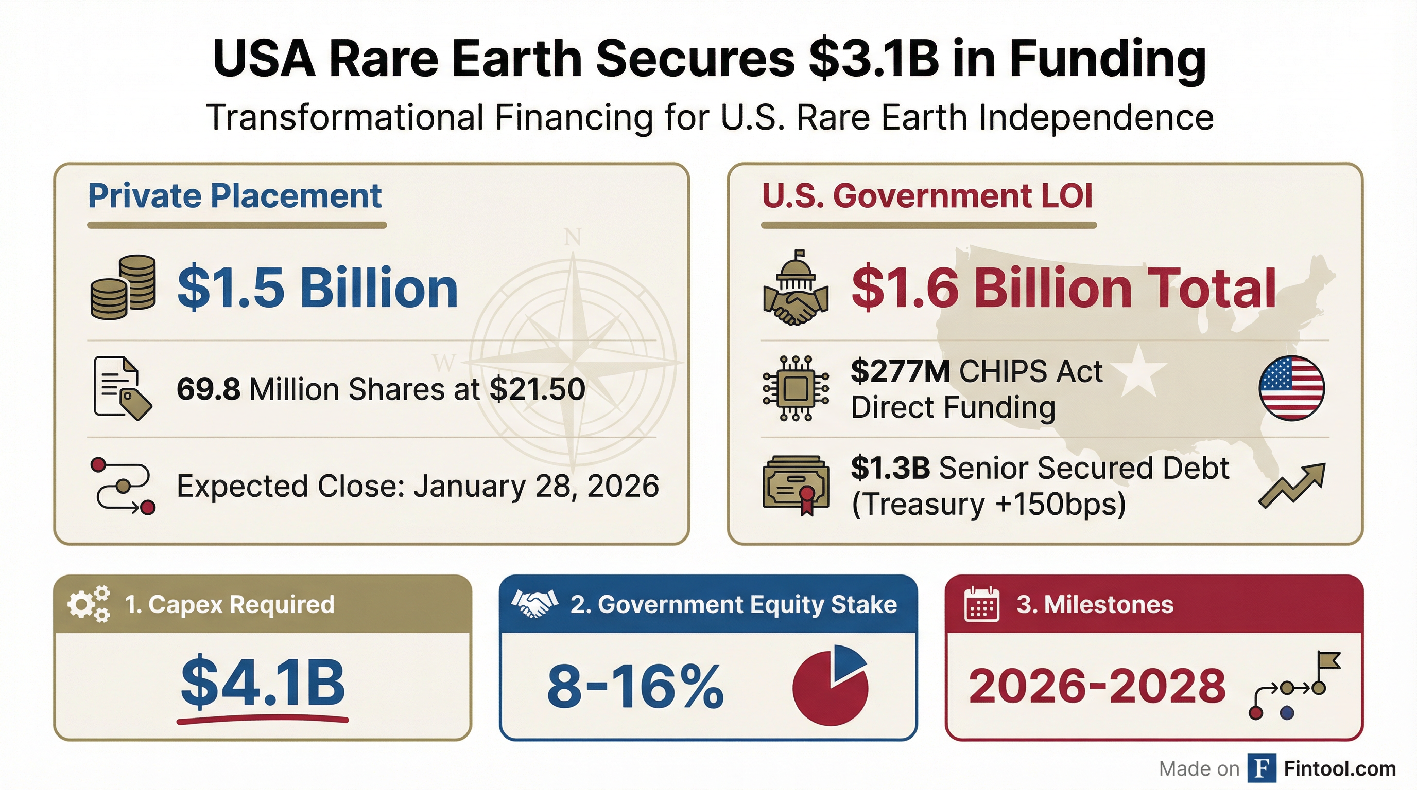 - USA Rare Earth entered a non-binding Letter of Intent with the U.S. Department of Commerce for $1.6 billion under the CHIPS Act, comprising $277 million in proposed federal funding and a $1.3 billion proposed senior secured loan.