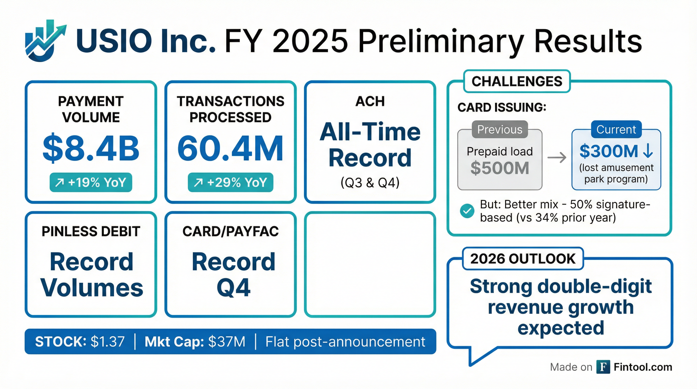 - Usio processed more than $8.4 billion in payment volume in 2025, a 19% year-over-year increase from $7.1 billion in 2024, and total payment transactions exceeded 60.4 million, up 29% from 47 million in the prior year.