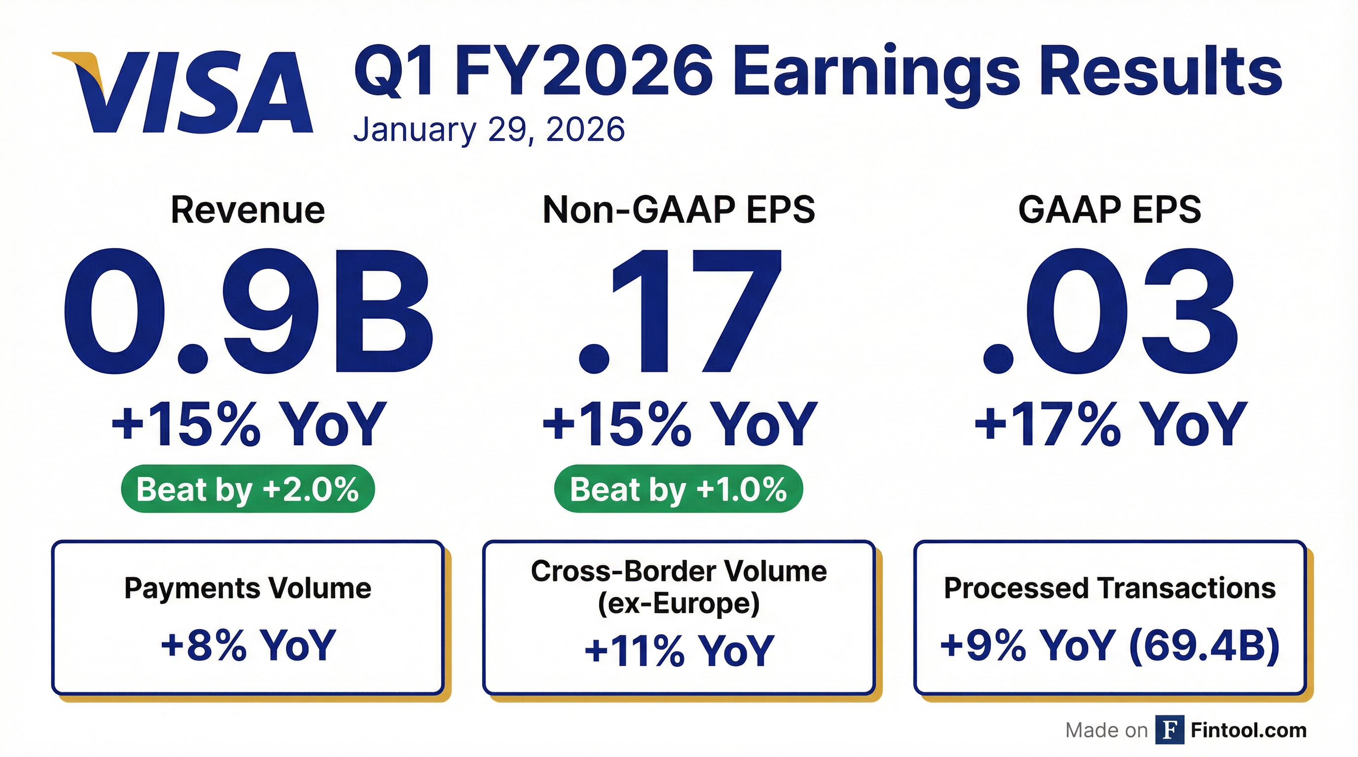 - Visa reports Q1 FY2026 net revenue of $10.9 B, up 15% YoY, and GAAP EPS of $3.03, up 17%; non-GAAP EPS was $3.17, up 15%