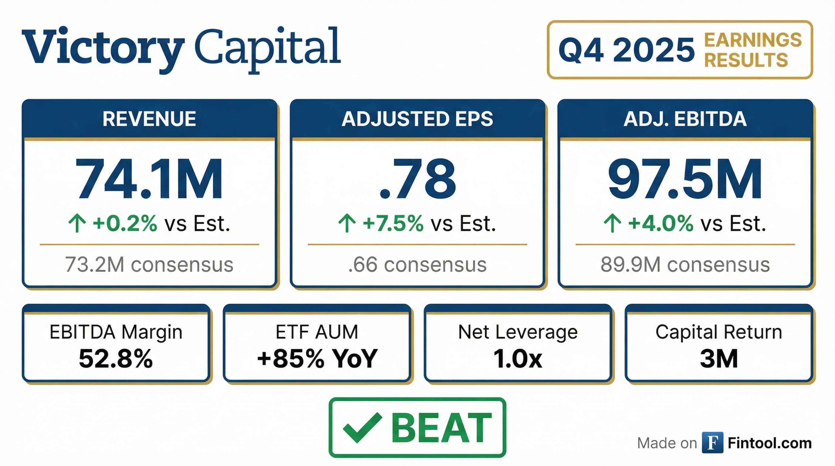 - Victory Capital Holdings (VCTR) reported a landmark year in 2025, achieving $1.3 billion in annual revenue for the first time , and reaching record adjusted EBITDA of $197.5 million and record adjusted EPS of $1.78 in Q4 2025. The company's Adjusted EBITDA margin increased to 52.8% in Q4 2025.