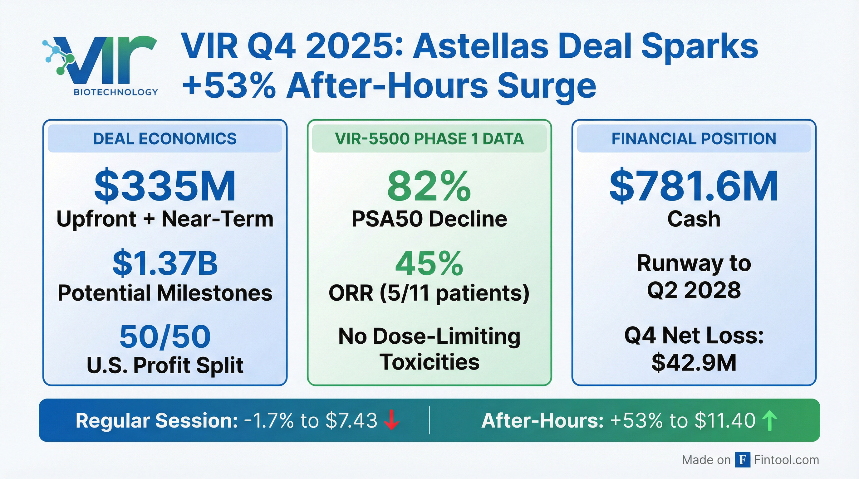 - Vir Biotechnology ended 2025 with approximately $782 million in cash, cash equivalents, and investments, and anticipates a cash runway extending into the second quarter of 2028.