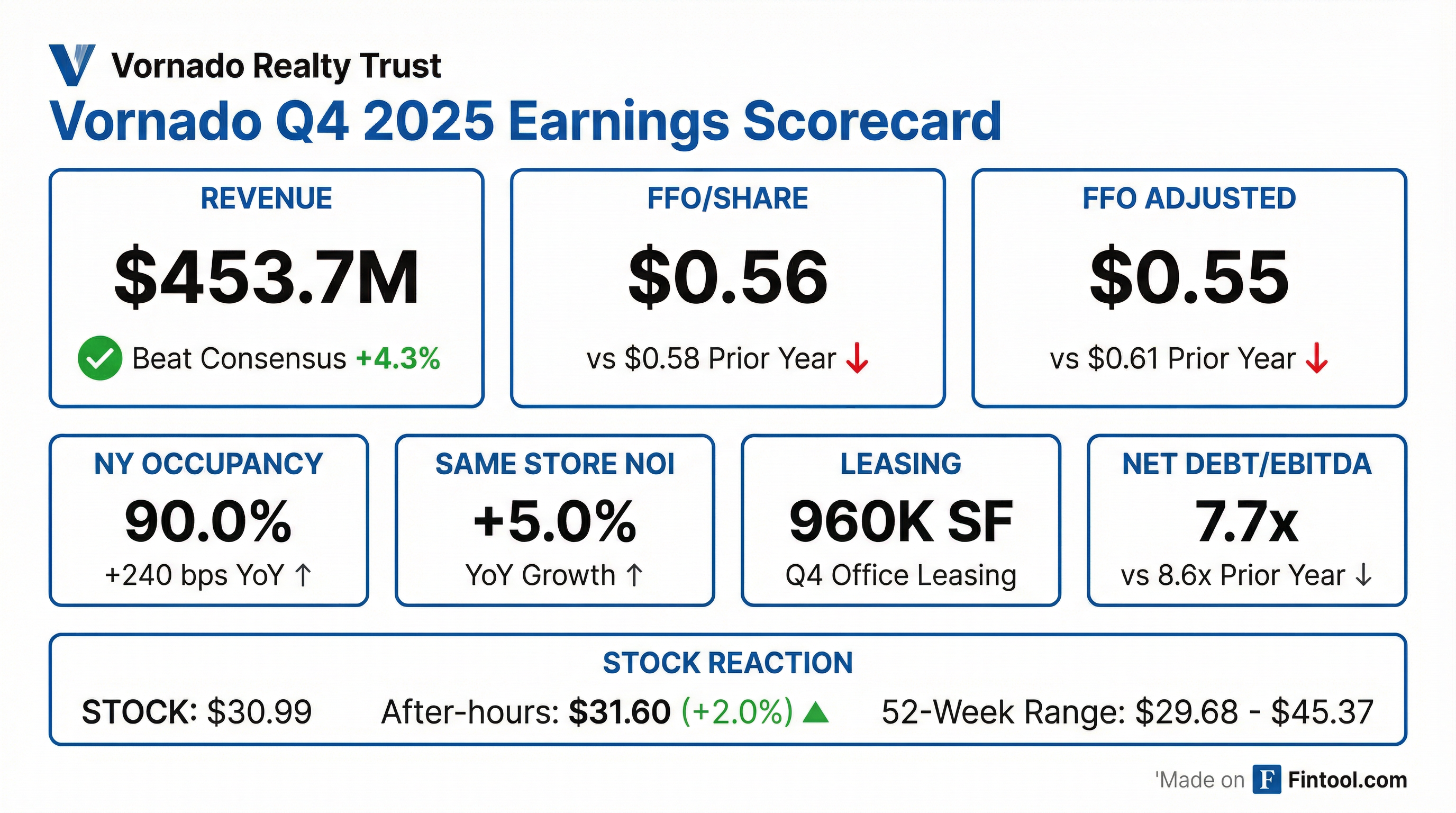 - Vornado Realty Trust reported Q4 2025 comparable FFO of $0.55 per share and full-year 2025 comparable FFO of $2.32 per share. New York office occupancy increased from 88.8% to 91.2% in 2025.