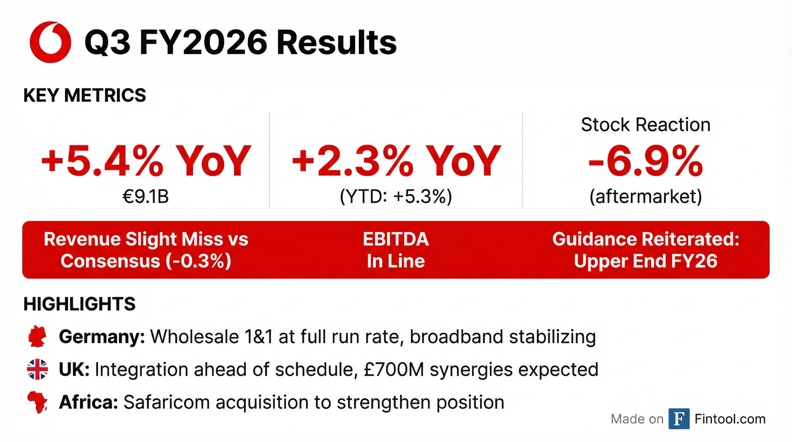 • Vodafone reported strong Q3 2026 results, with Group service revenue growing by 5.4% and Group EBITDA by 2.3%, and is on track to deliver the upper end of its FY 2026 guidance.