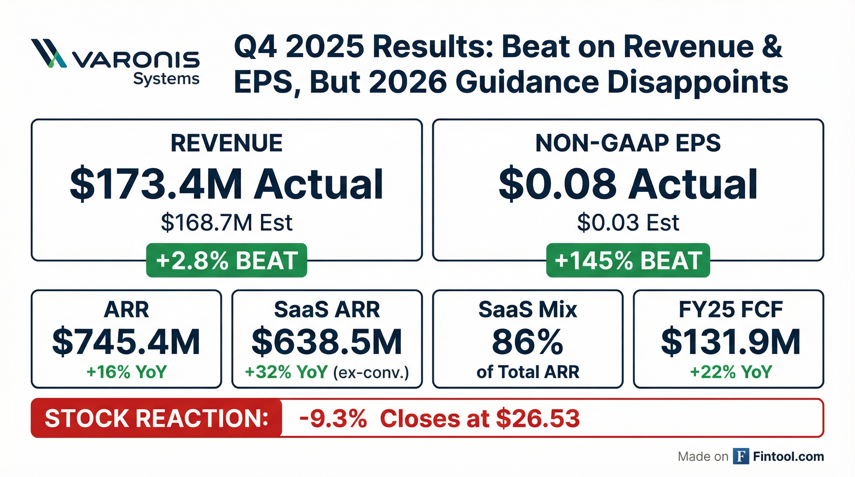 - Varonis reported Q4 2025 SaaS ARR of $638.5 million, representing 86% of total ARR, with SaaS ARR (excluding conversions) increasing 32% year-over-year. Total revenues for the quarter were $173.4 million, and non-GAAP net income was $11.1 million, or $0.08 per diluted share.