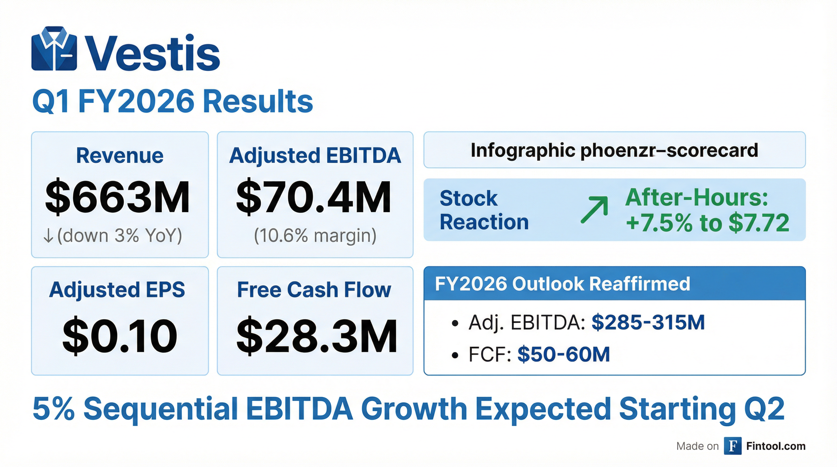 - Vestis Corporation reported Q1 2026 revenue of $663.4 million, a 3% decline versus Q1 2025, and Adjusted EBITDA of $70.4 million, representing a 10.6% margin.
