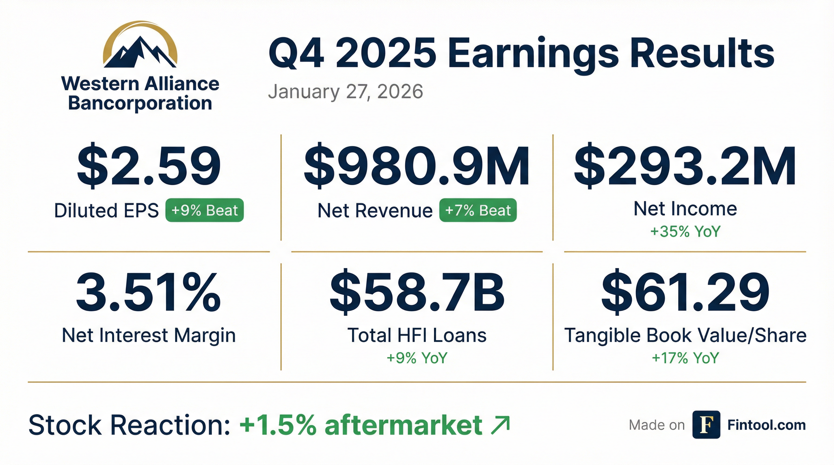 • Western Alliance Bancorporation reported Earnings per Share of $2.59 and Net Revenue of $980.9 million for Q4 2025, with EPS increasing 32.8% year-over-year.